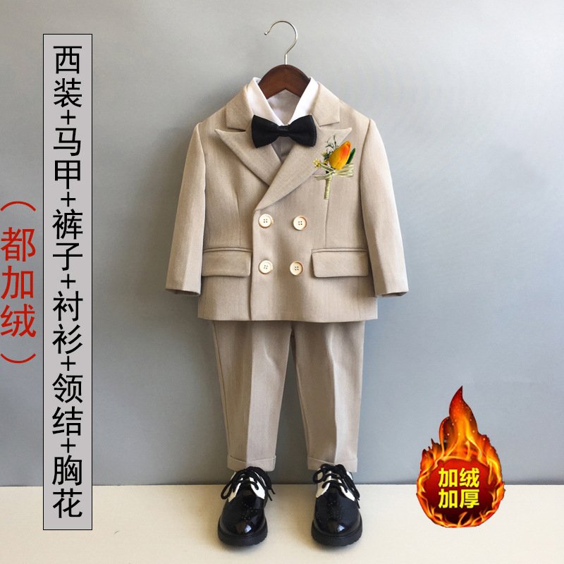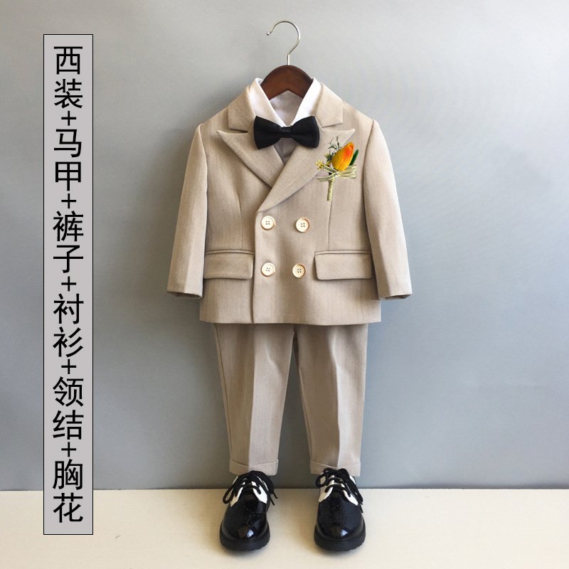 • (Full Set Plus Velvet) Beige (Suit Waistcoat Pants Shirt Black Bow Tie Tulip Gold Corsage) – 6Y (130)