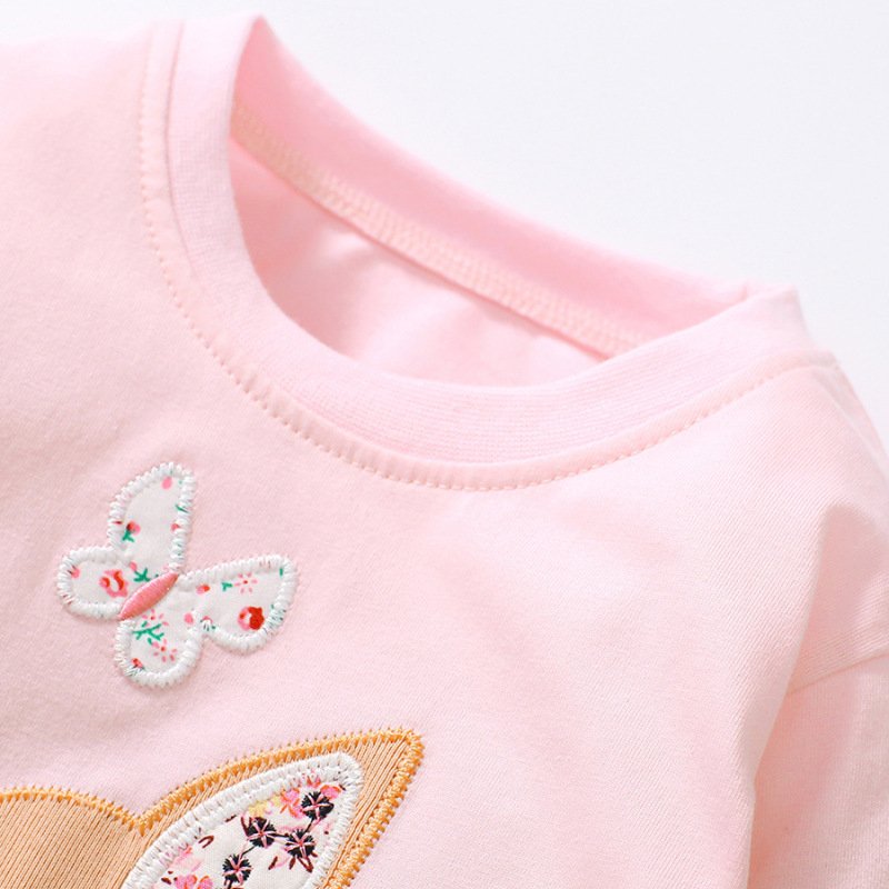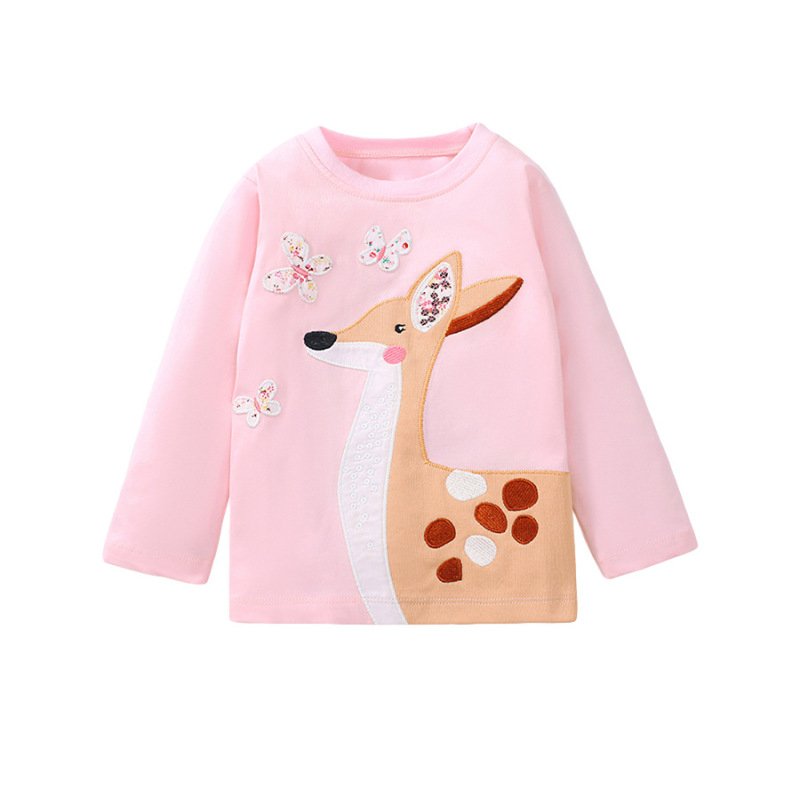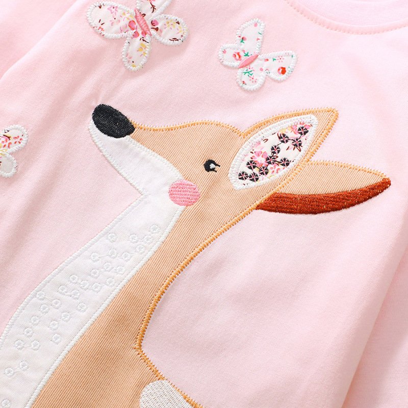 Kids Toddler Big Girls Fashion Casual Cute Butterfly Fawn Embroidery Round Neck Long Sleeve T-Shirt
