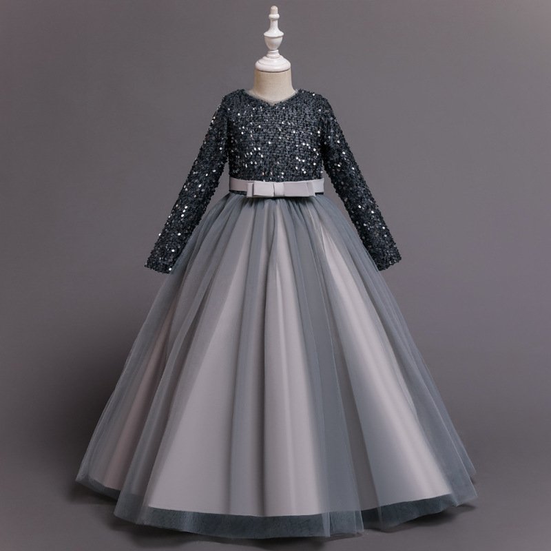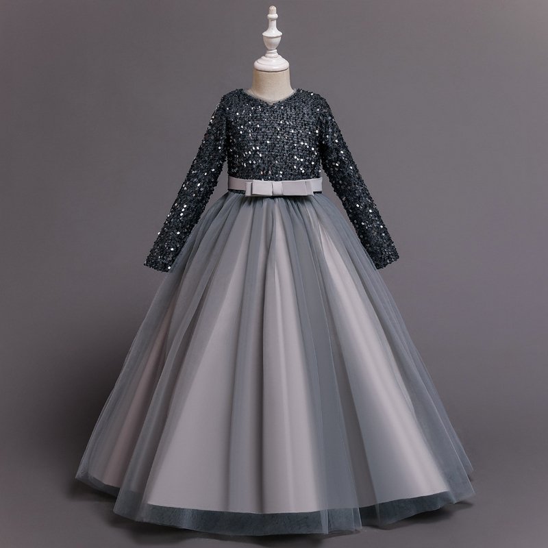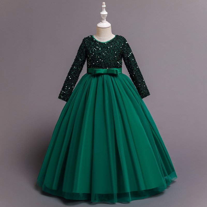 Kids Toddler Big Girls Fashion Party Cute Sweet Sequins Bow Pleated Long Sleeve Mesh Party Tutu Dress