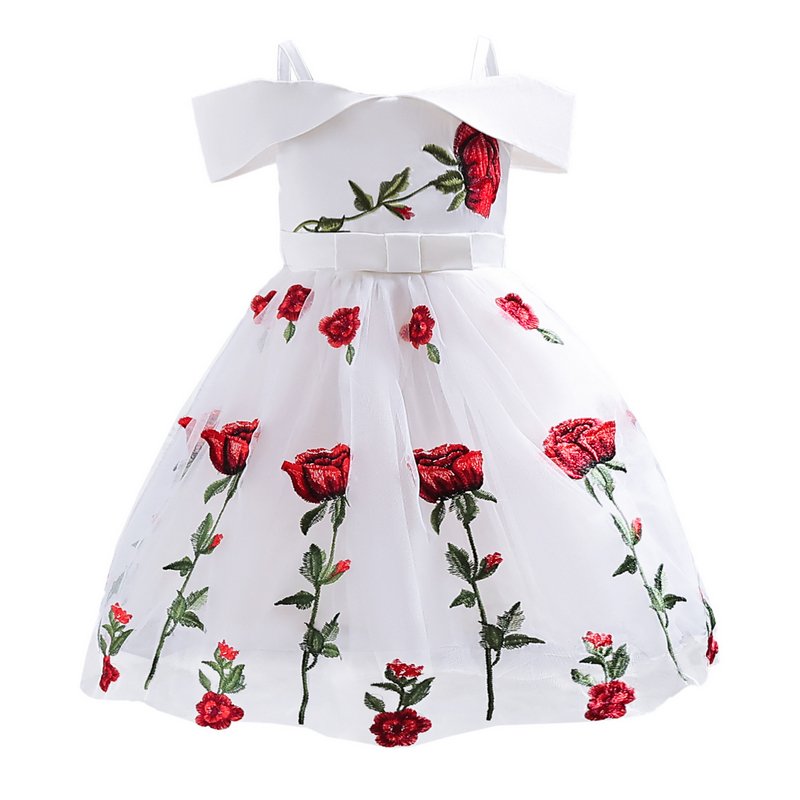 Kids Toddler Big Girls Fashion Party Cute Sweet Solid Color Rose Embroidery Pleated Off Shoulder Sleeveless Mesh Party Tutu Slip Dress