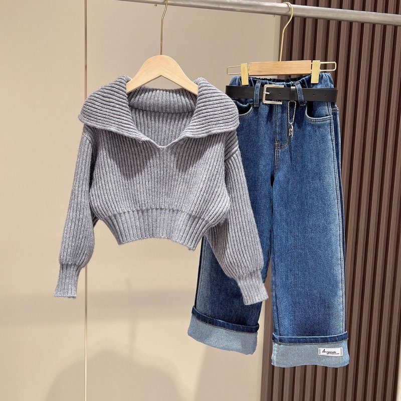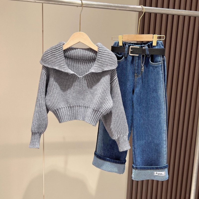 Kids Toddler Big Girls Spring Autumn Fashion Casual Solid Color Long Sleeve Knitwear Sweater Jeans Set