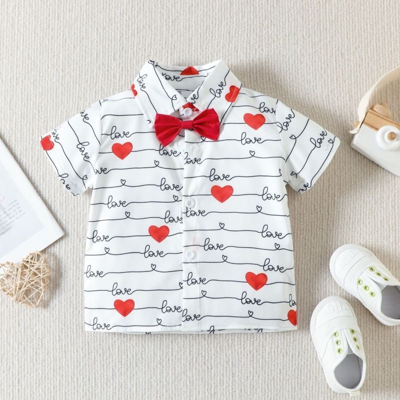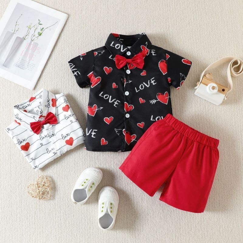 Kids Toddler Boys Casual Cute Letter Heart Print Bow Short Sleeve Lapel Shirt Shorts Set