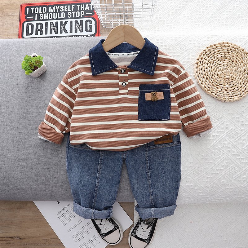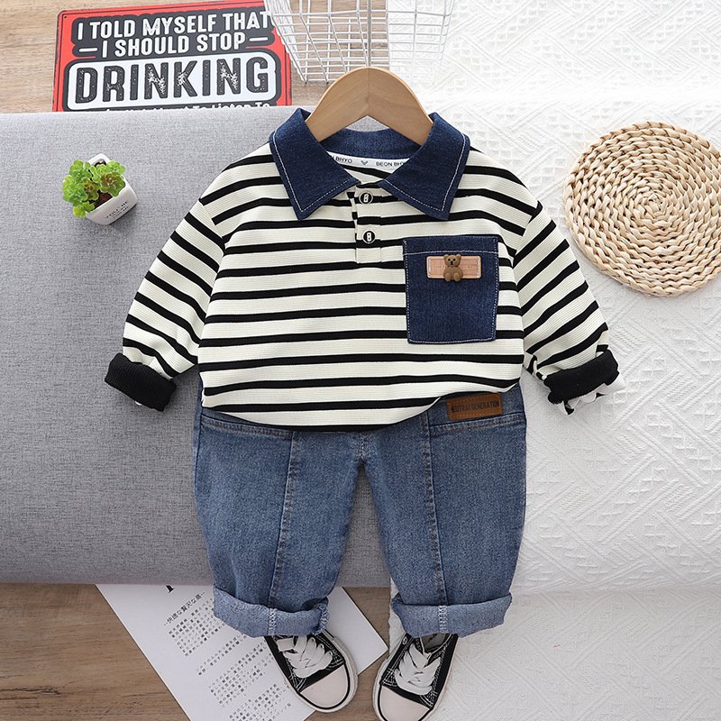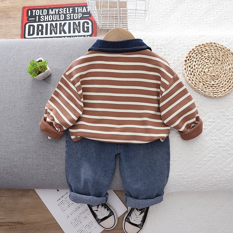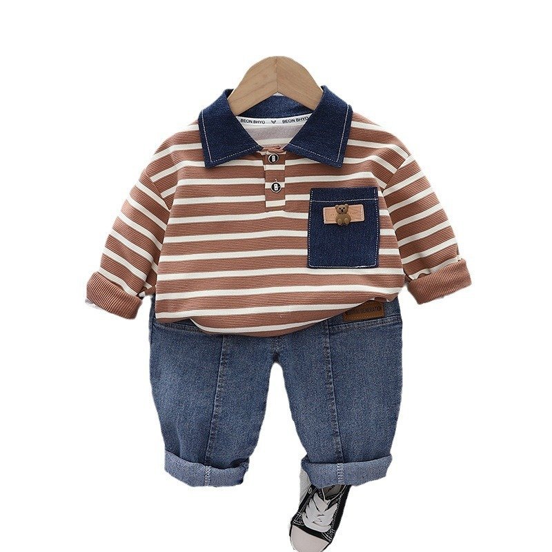 Kids Toddler Boys Fashion Casual Cute Stripe Print Long Sleeve Lapel Sweatshirts Jeans Set