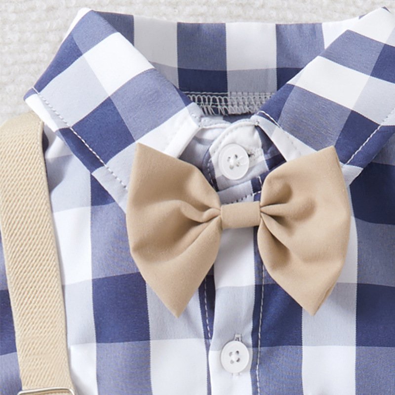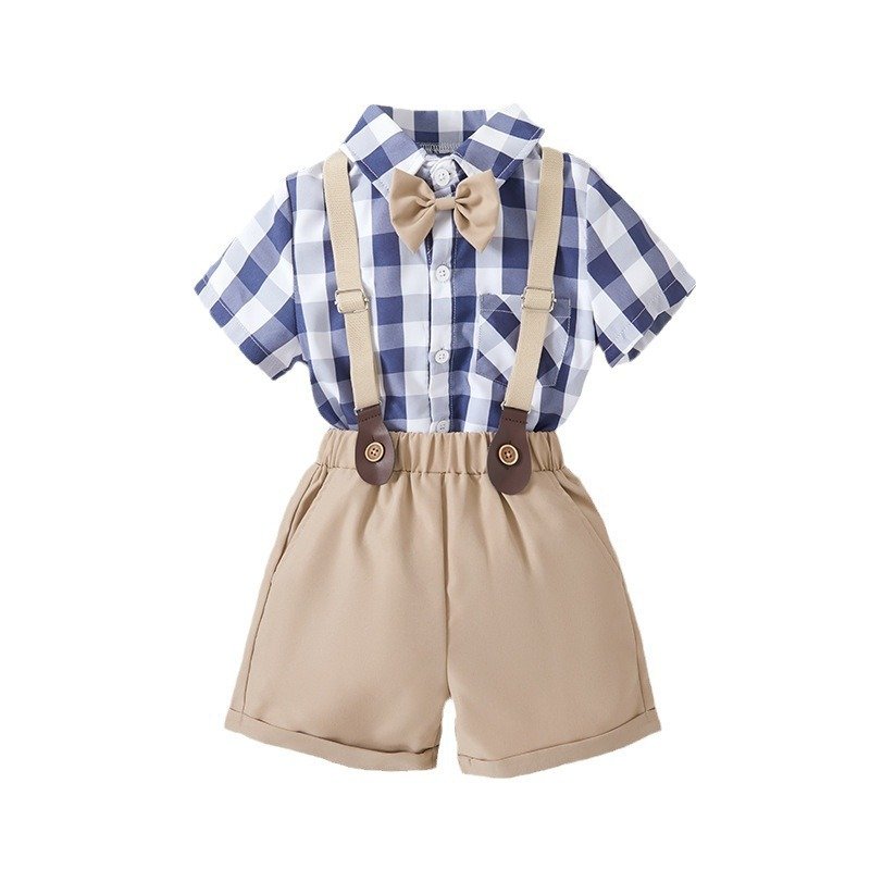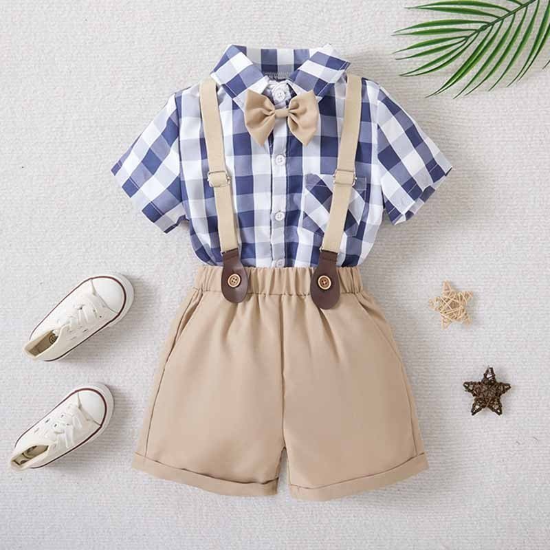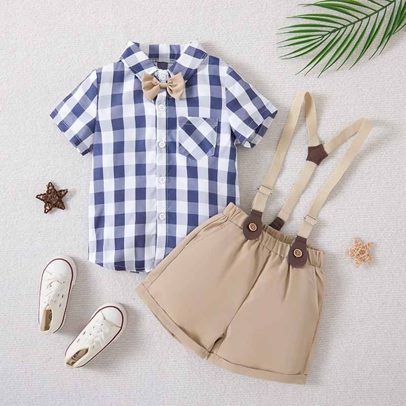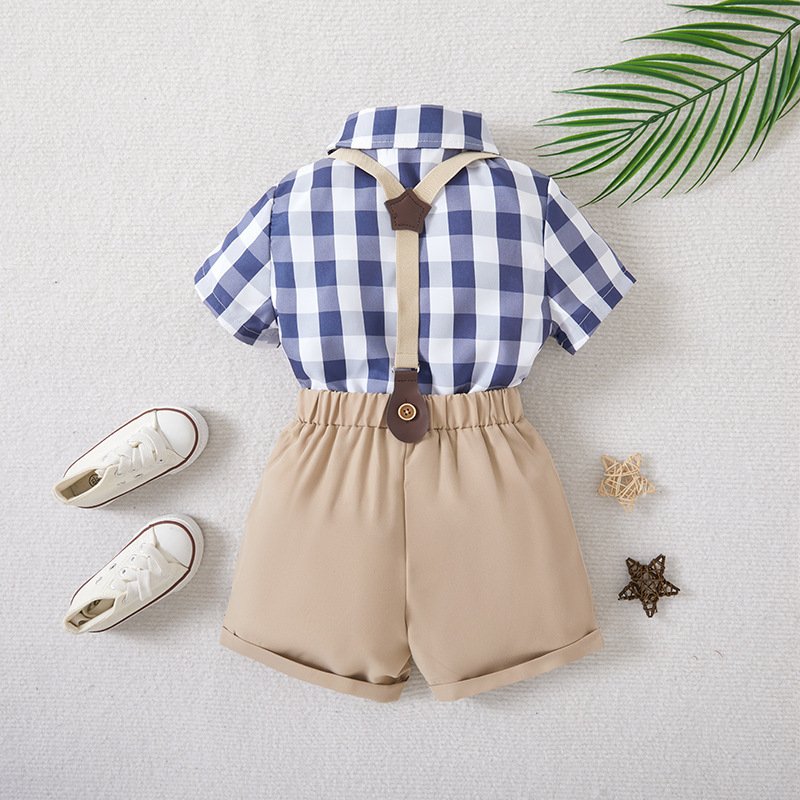 Kids Toddler Boys Party British Style Plaid Print Short-Sleeved Lapel Shirt Suspender Pants Set