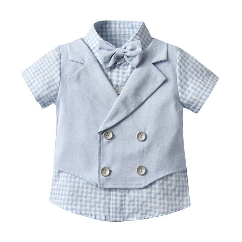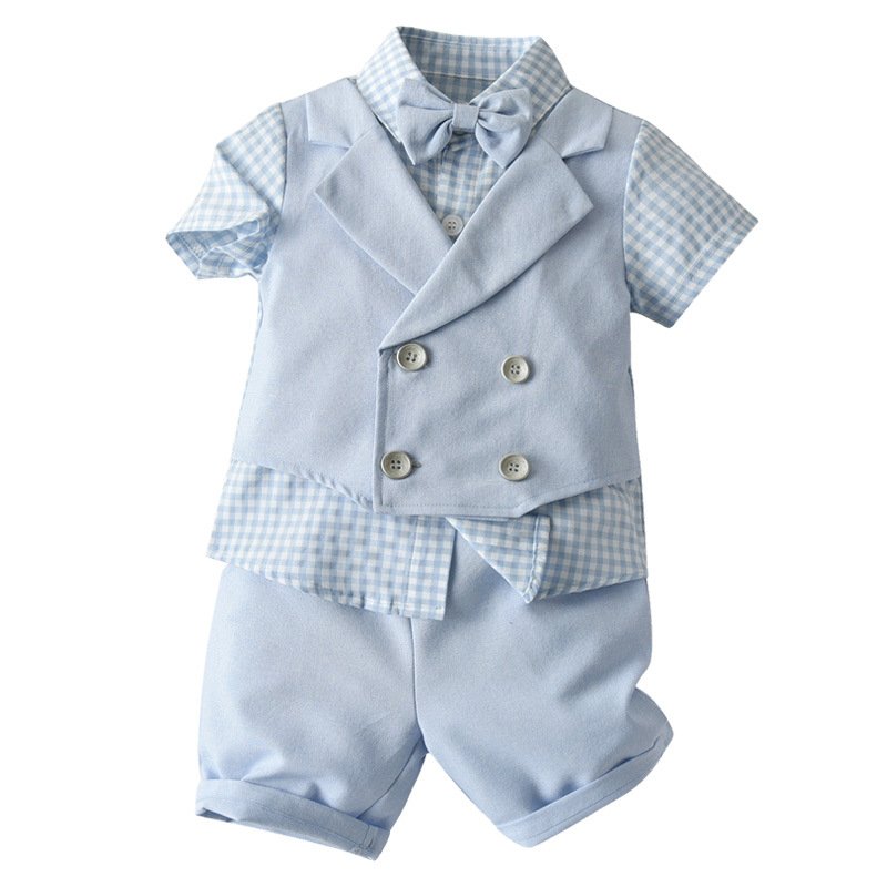 Kids Toddler Boys Summer Fashion Casual British Style Bow Playd Waistcoat Shirt Shorts Boys Party Clothing Set