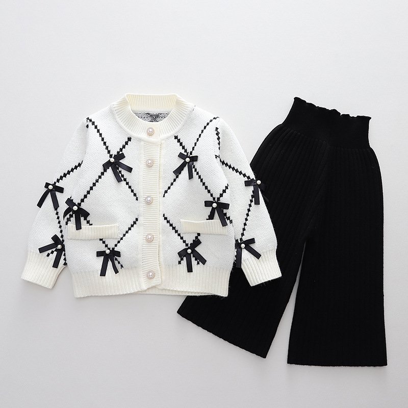 Kids Toddler Girls Autumn Winter Fashion Casual Simple Color Bow Button Round Neck Sweater Pants Set