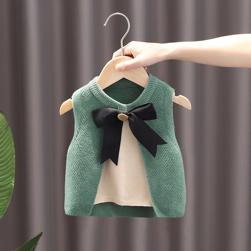 Kids Toddler Girls Autumn Winter Fashion Casual Simple Solid Color Bow Round Neck Sweater Waistcoat