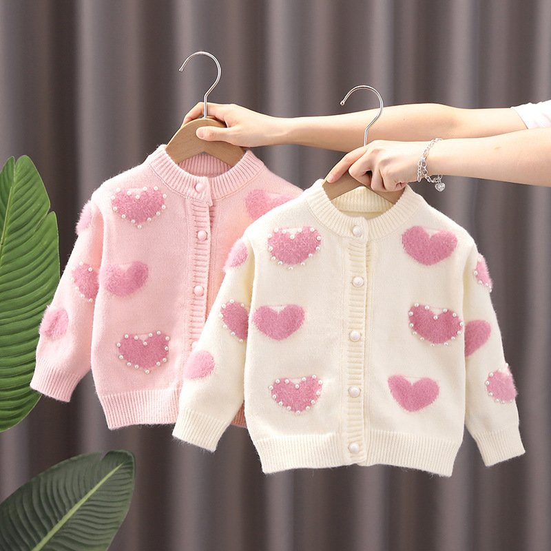 Kids Toddler Girls Autumn Winter Fashion Casual Simple Solid Color Heart Shape Pearl Button Round Neck Sweater