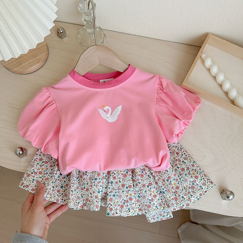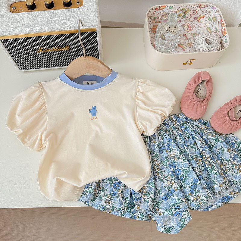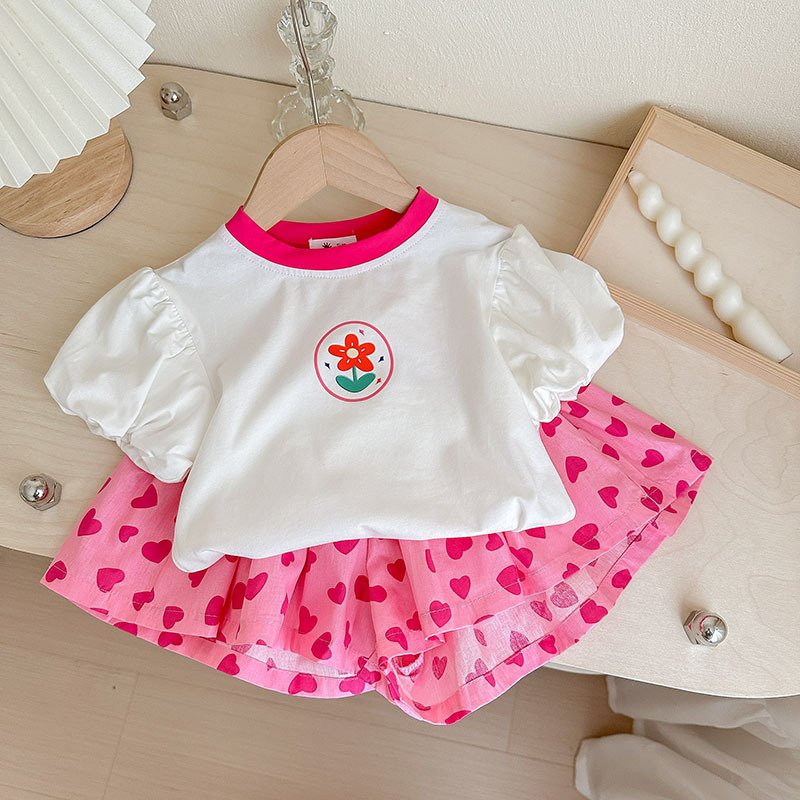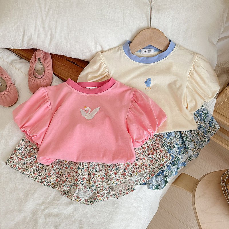 Kids Toddler Girls Casual Cute Cartoon Print Puff Sleeve T-Shirt Tiny Flower Shorts Set