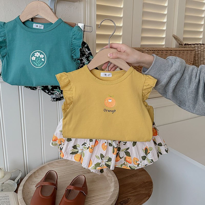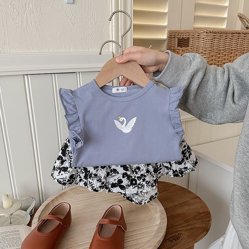 Kids Toddler Girls Casual Cute Cartoon Print Sleeveless T-Shirt Tiny Flower Shorts Set