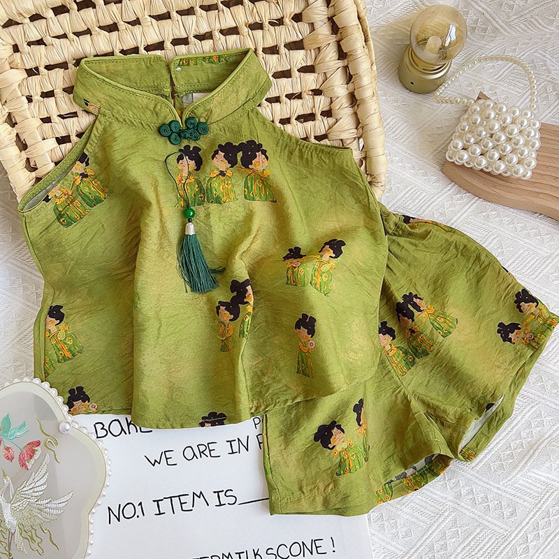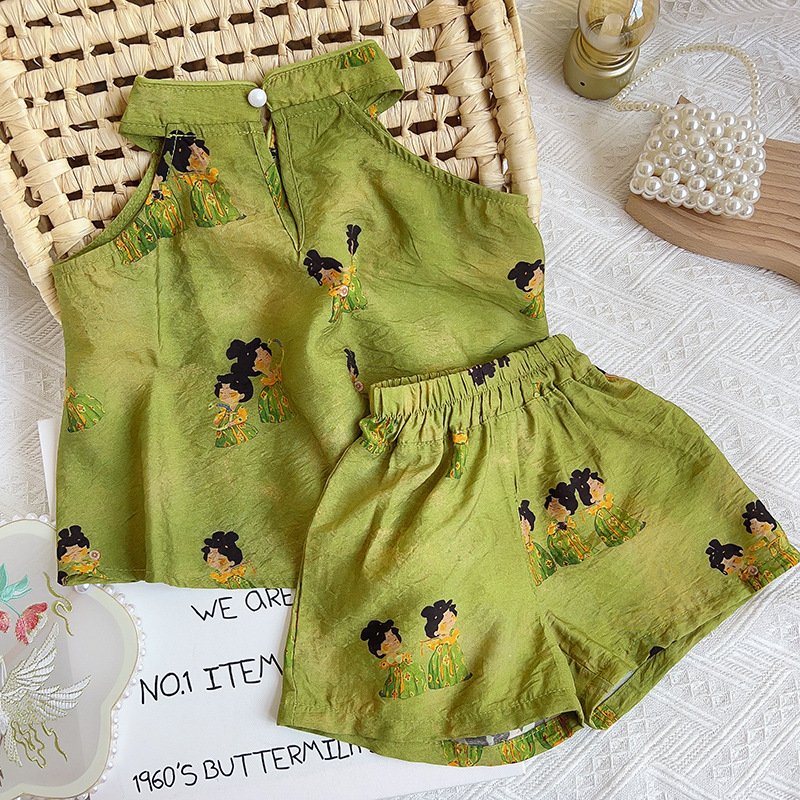 • Green Chinese Printed Sleeveless Shorts Set – 2Y (100)