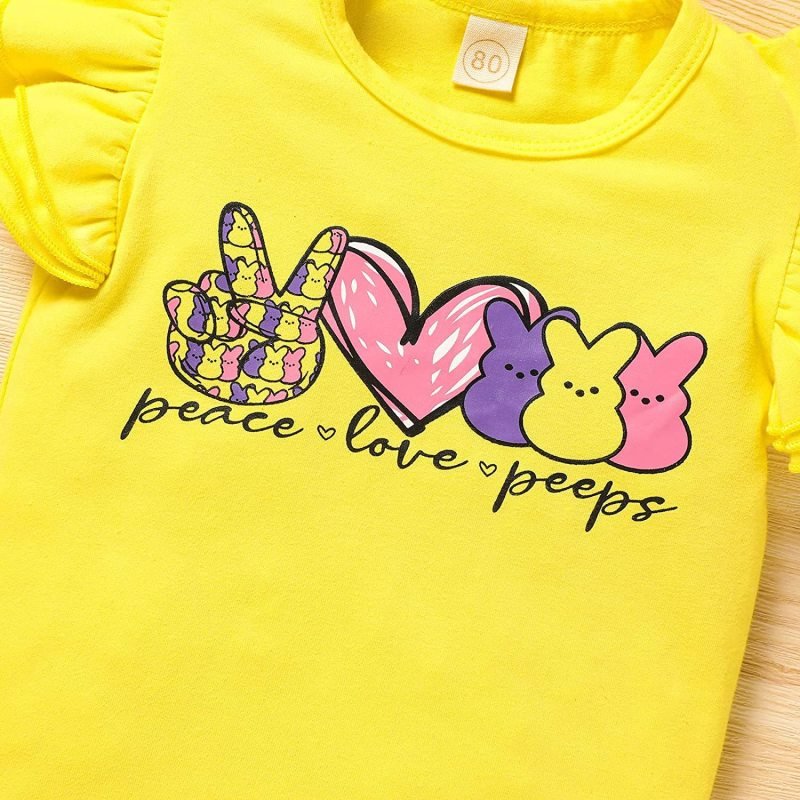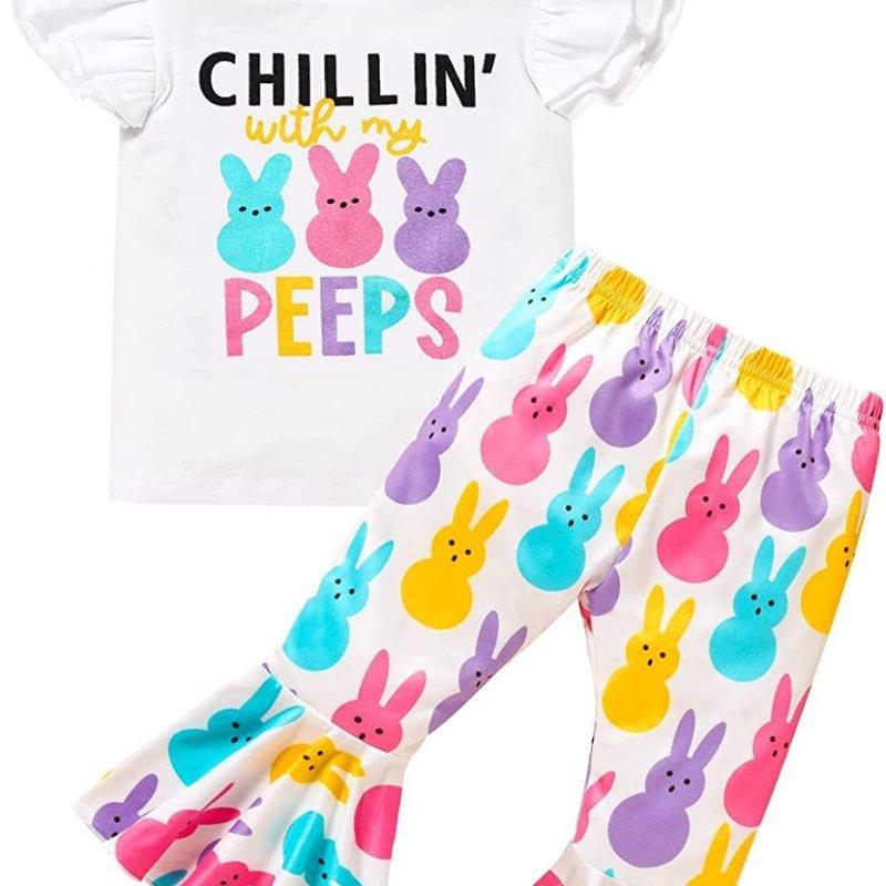 Kids Toddler Girls Casual Cute Easter Day Cartoon Rabbit Letter Print Raglan Sleeve Round Neck T-Shirt Flare Trousers Set