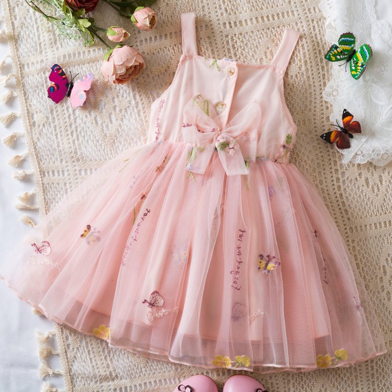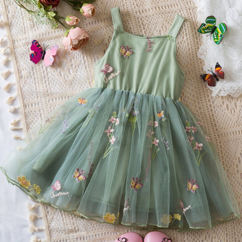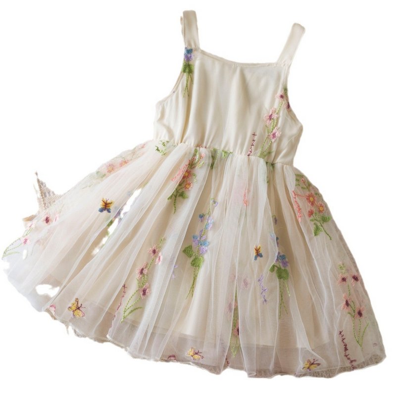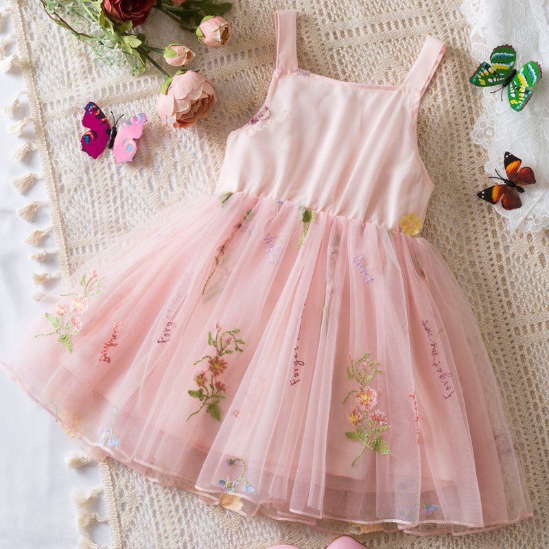 Kids Toddler Girls Casual Cute Embroidery Flower Mesh Strap Dress