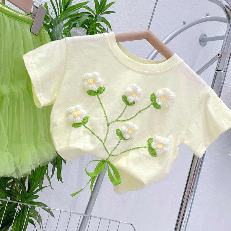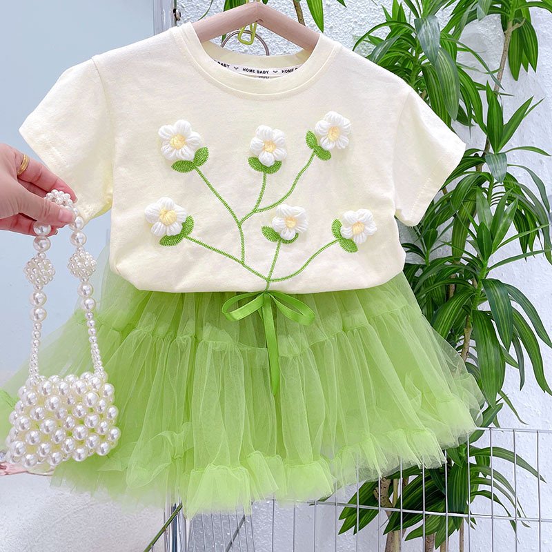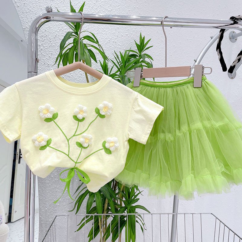 Kids Toddler Girls Casual Cute Flower Short Sleeve T-Shirt Mesh Skirt Set
