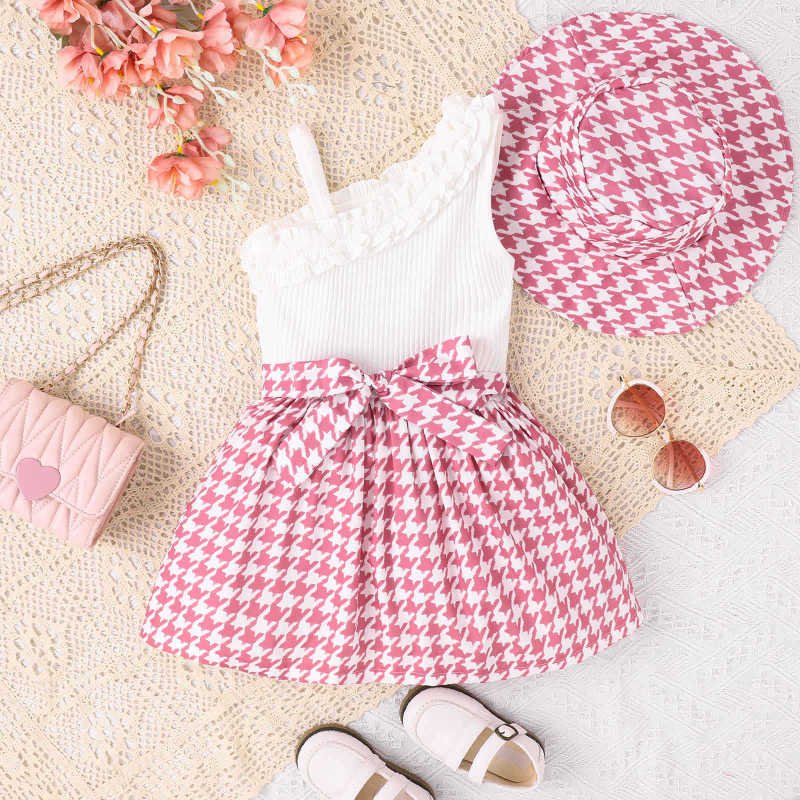Kids Toddler Girls Casual Cute Patchwork Houndstooth Print Oblique Shoulder Dress