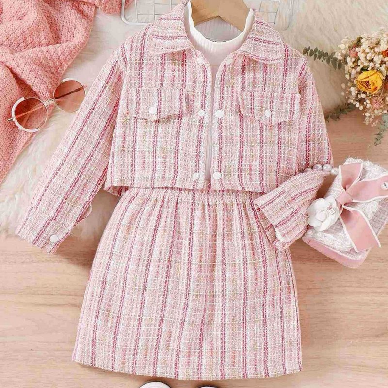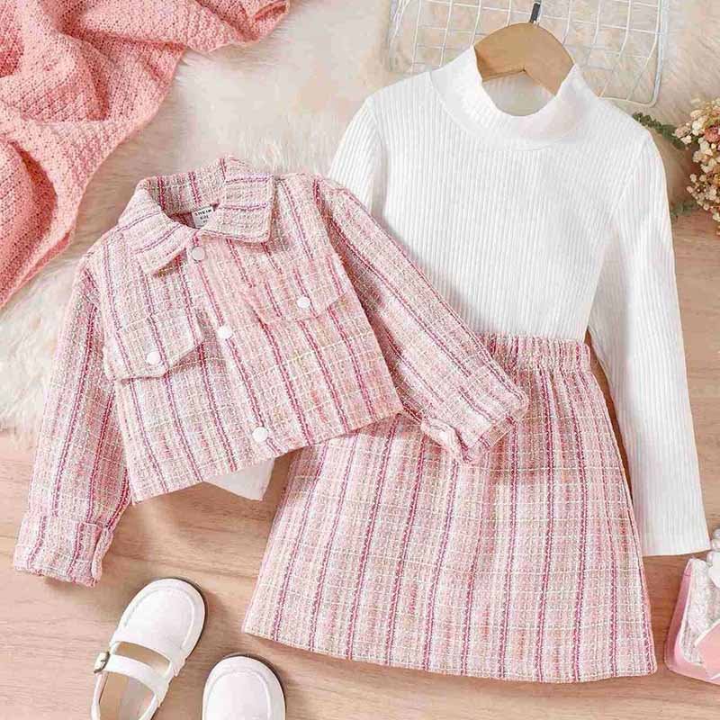 Kids Toddler Girls Casual Cute Stripe Top Long Sleeve Coat Skirt Three-Piece Sets