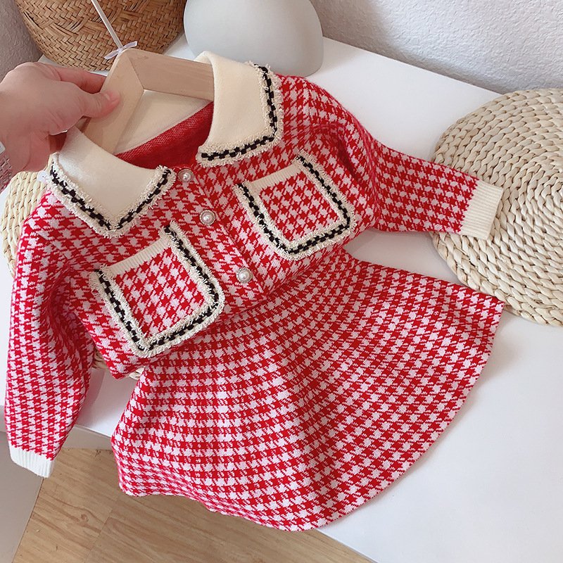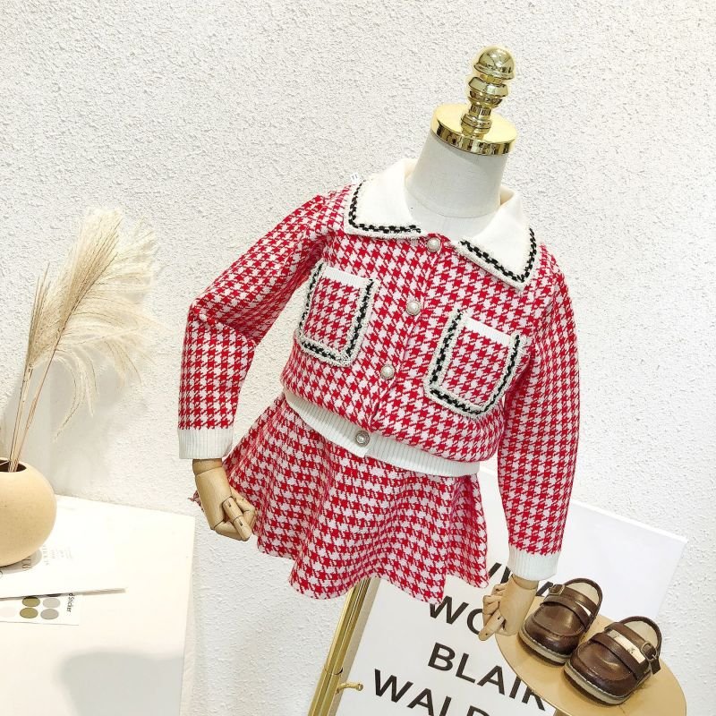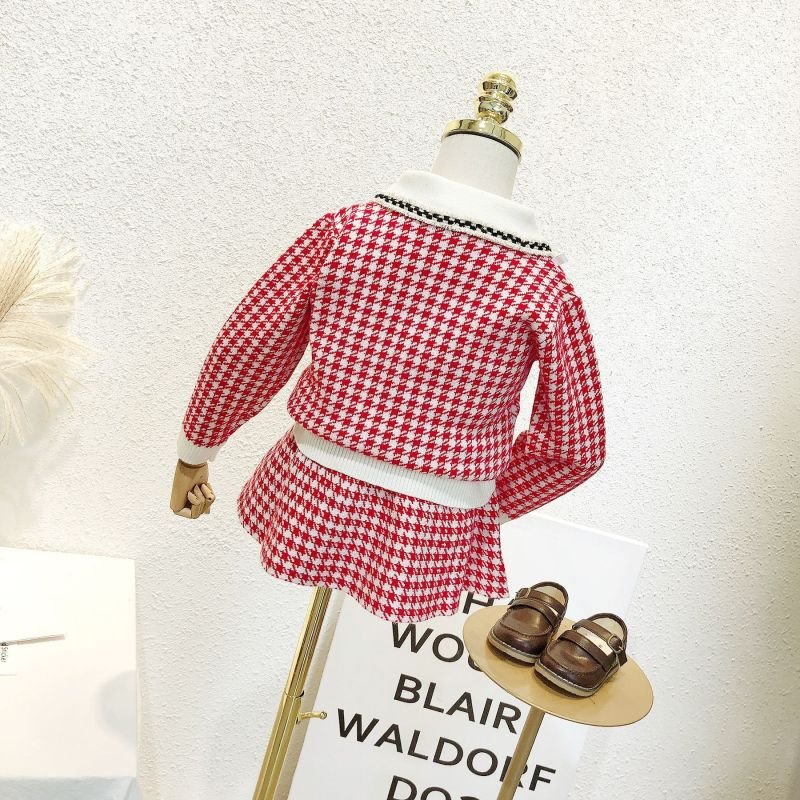 Kids Toddler Girls Casual Cute Sweet Houndstooth Long Sleeve Lapel Top Skirt Set