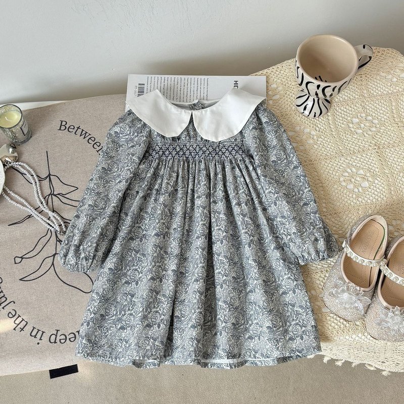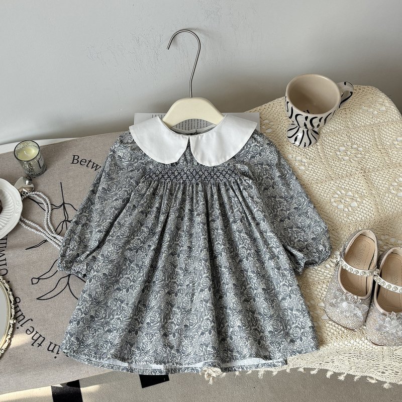 Kids Toddler Girls Casual Cute Tiny Flower Print Long Sleeve Peter Pan Collar Dress