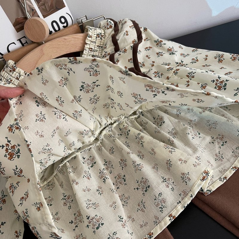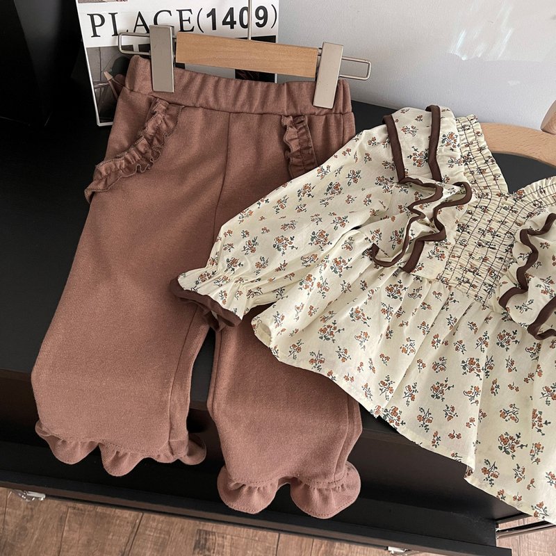 Kids Toddler Girls Casual Cute Tiny Flower Print Long Sleeve V Neck Shirt Trousers Set