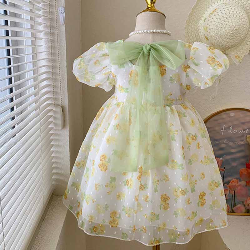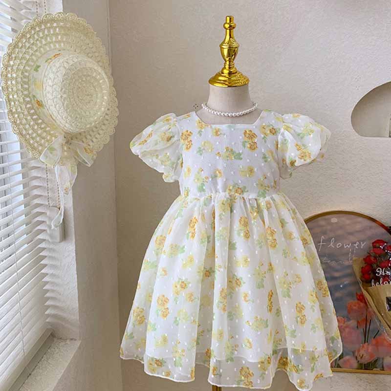 Kids Toddler Girls Casual Cute Tiny Flower Print Puff Sleeve Mesh Dress
