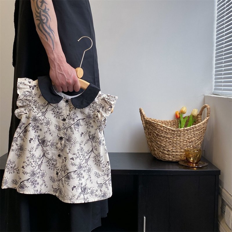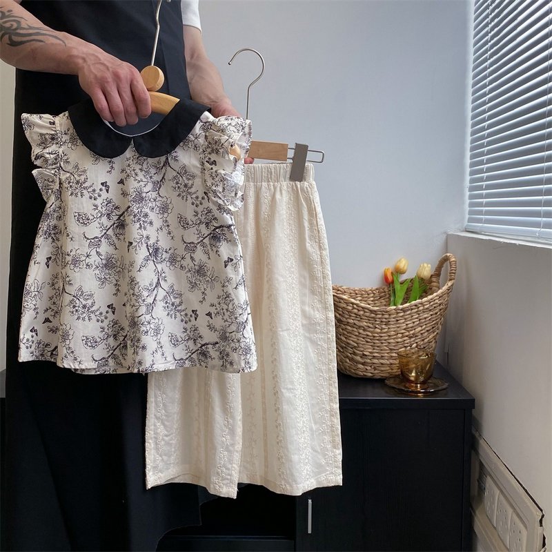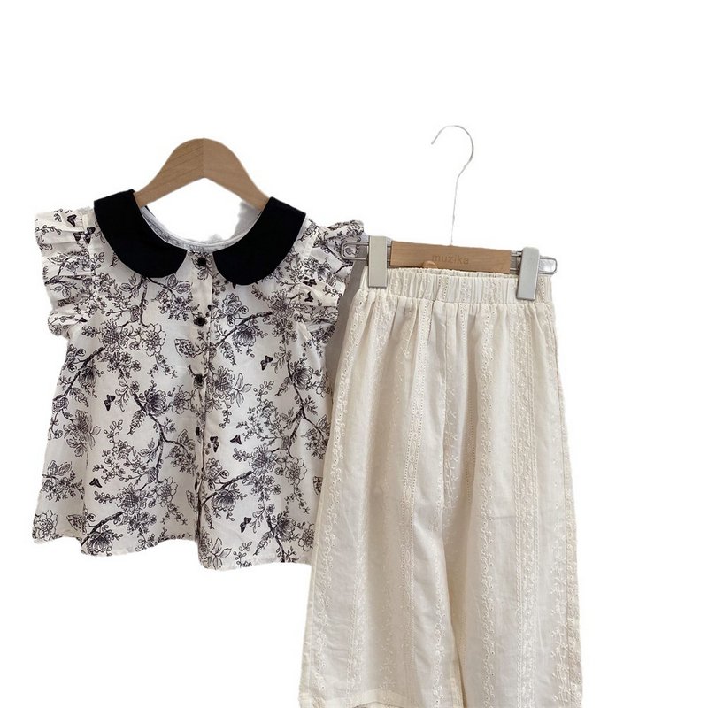 Kids Toddler Girls Casual Cute Tiny Flower Print Sleeveless Peter Pan Collar Blouses Pants Set