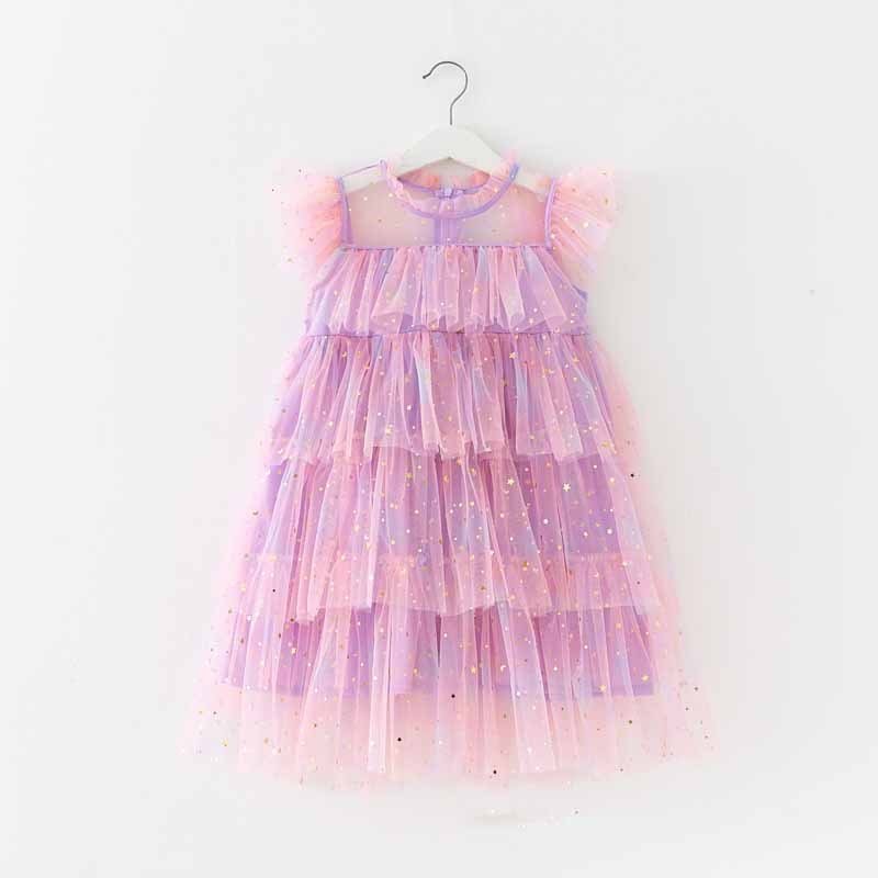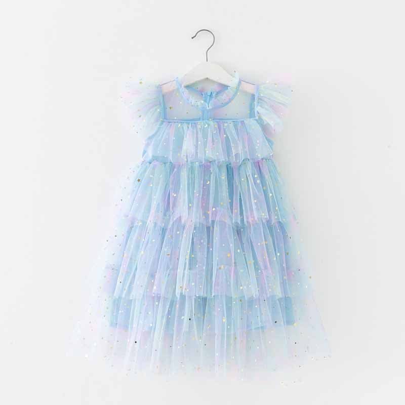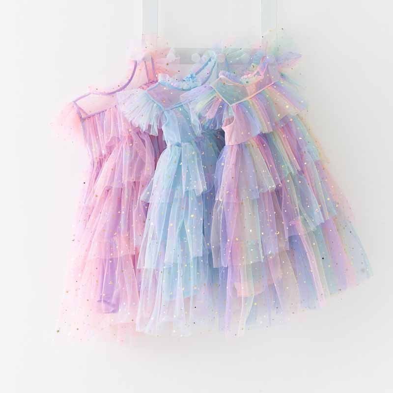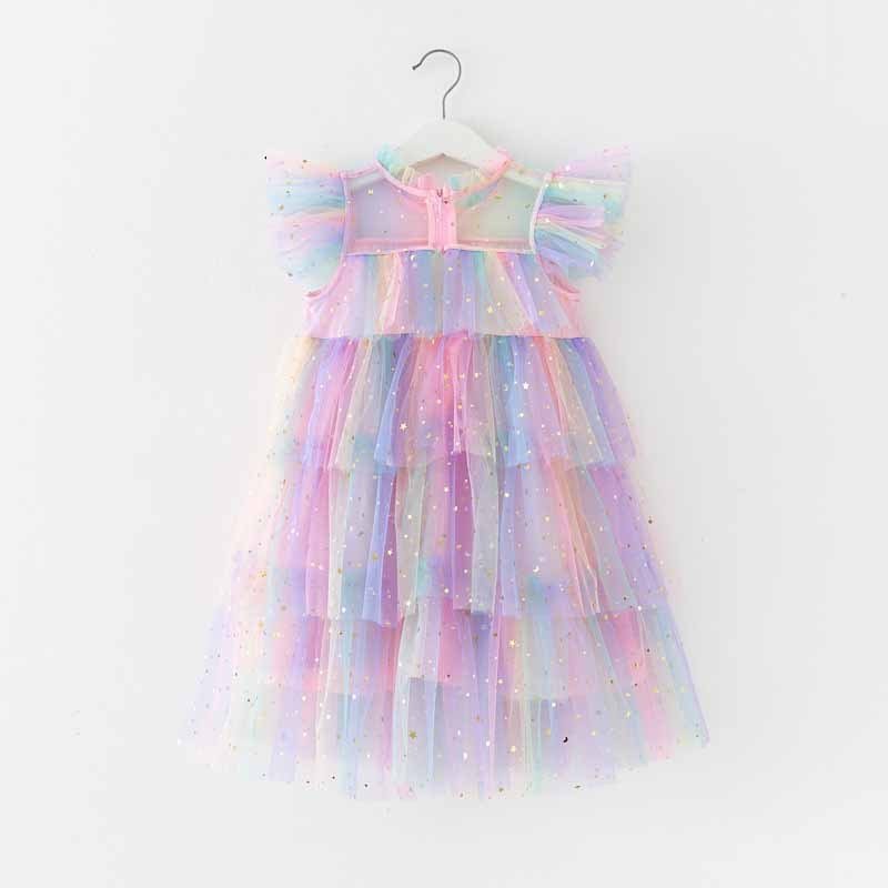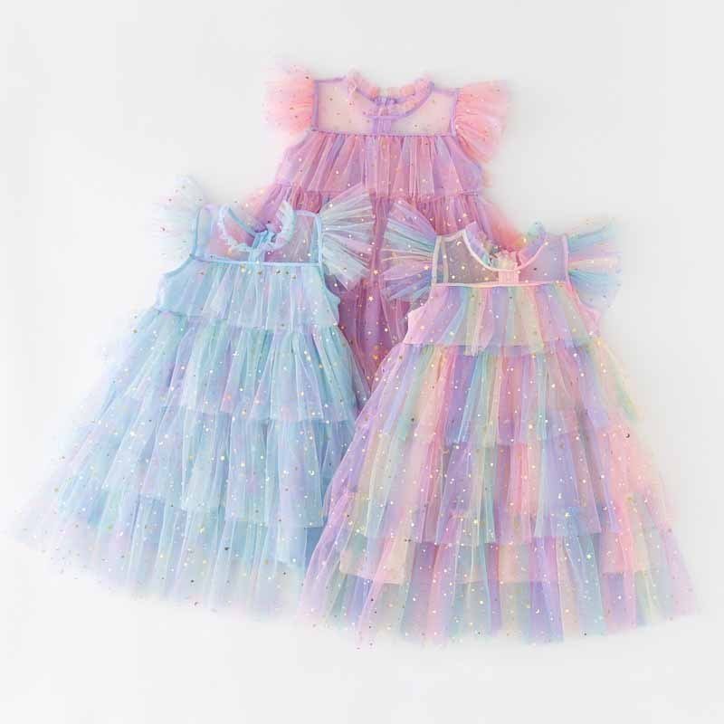 Kids Toddler Girls Cute Multicolor Mesh Fluttering Sleeve Party Tutu Princess Dress
