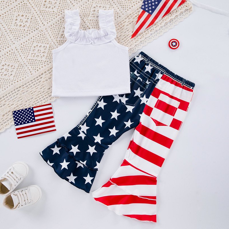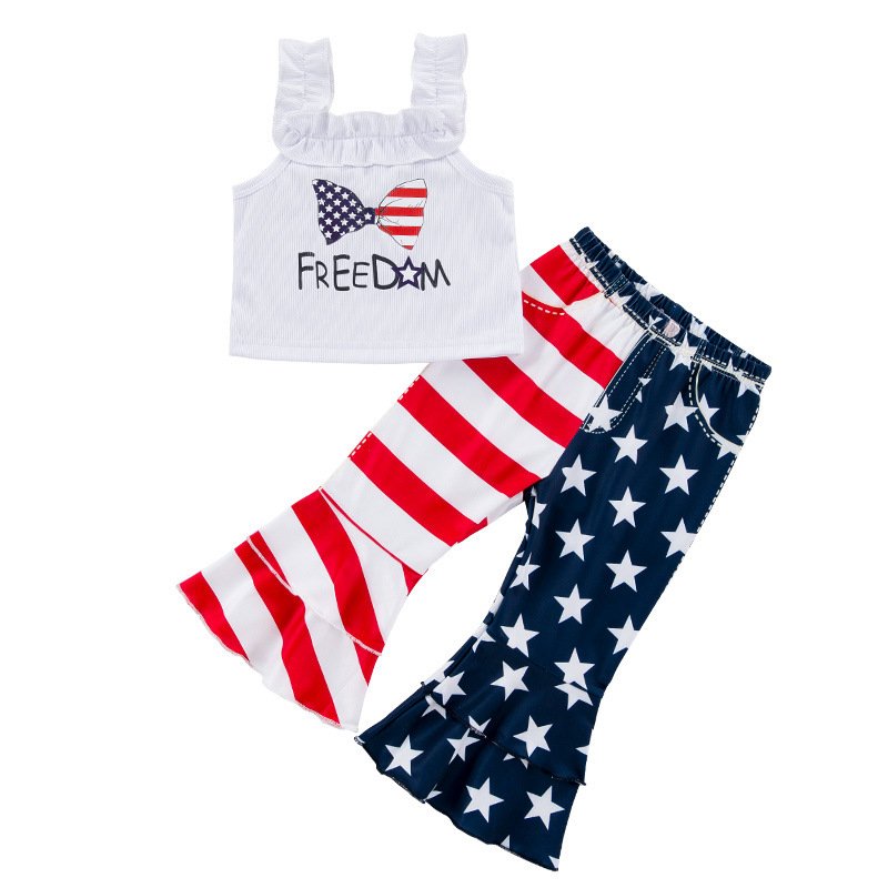 Kids Toddler Girls Cute Party Independence Day Bow Letter Camisole Flare Trousers Set