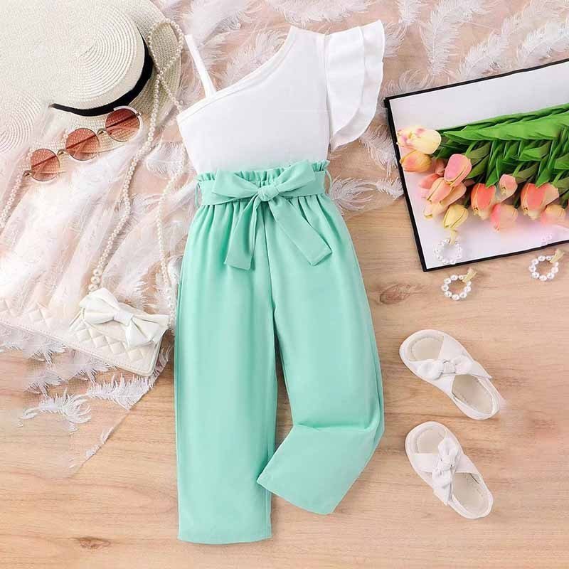 Kids Toddler Girls Cute Sweet Slanted Shoulder Cami Top Trousers Set