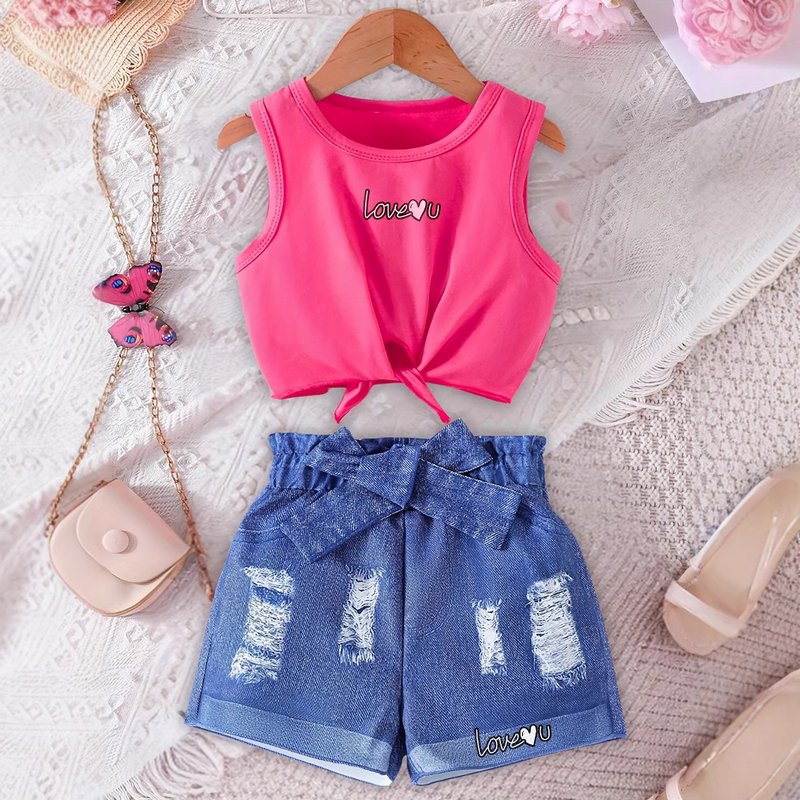 Kids Toddler Girls Fashion Casual Alphabet Print Tank Top Denim Shorts Sets