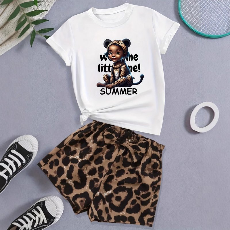 Kids Toddler Girls Fashion Casual Print Short Sleeve T-Shirt Leopard Shorts Sets