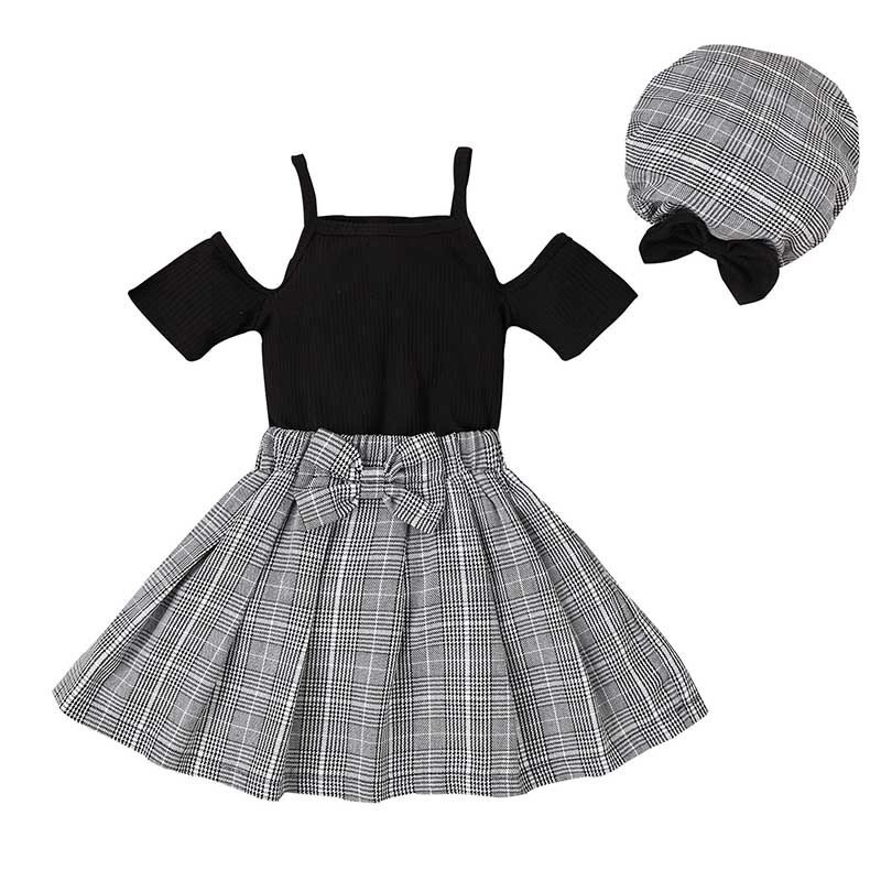Kids Toddler Girls Fashion Casual Solid Color Off Shoulder Top Plaid Skirt Set