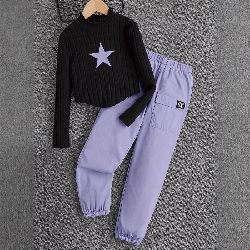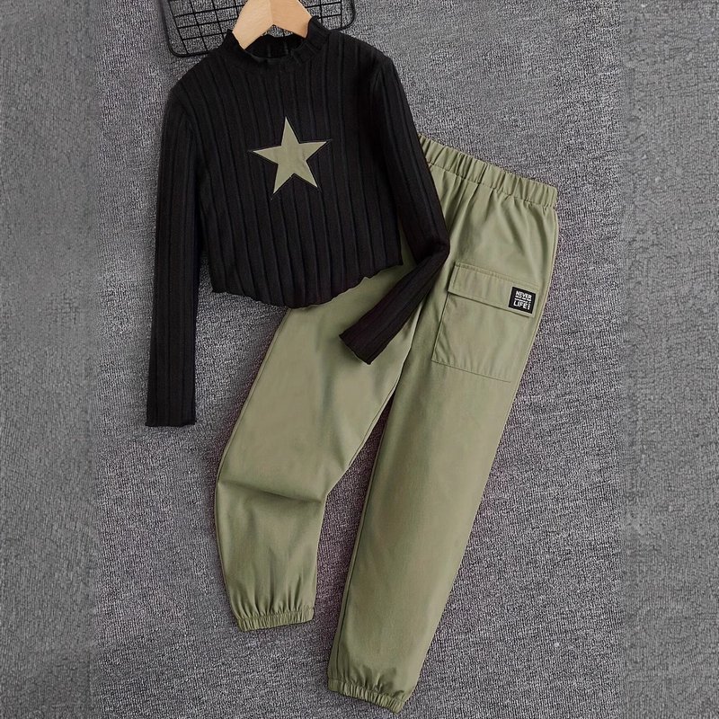 Kids Toddler Girls Fashion Casual Star Embroidery Long Sleeve Top Cargo Pants Sets