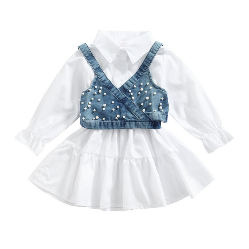 Kids Toddler Girls Solid Color Long-Sleeved Patchwork Beaded Denim Vest Shirt Dress