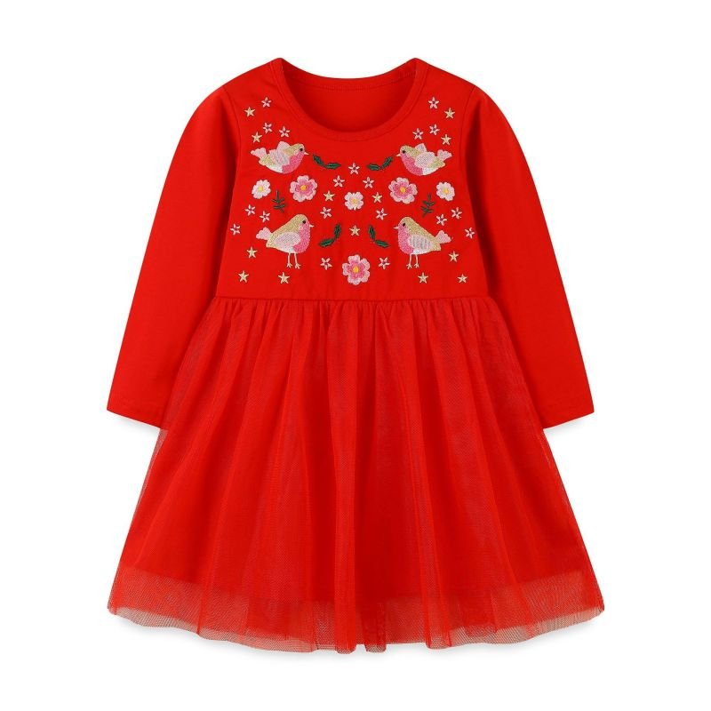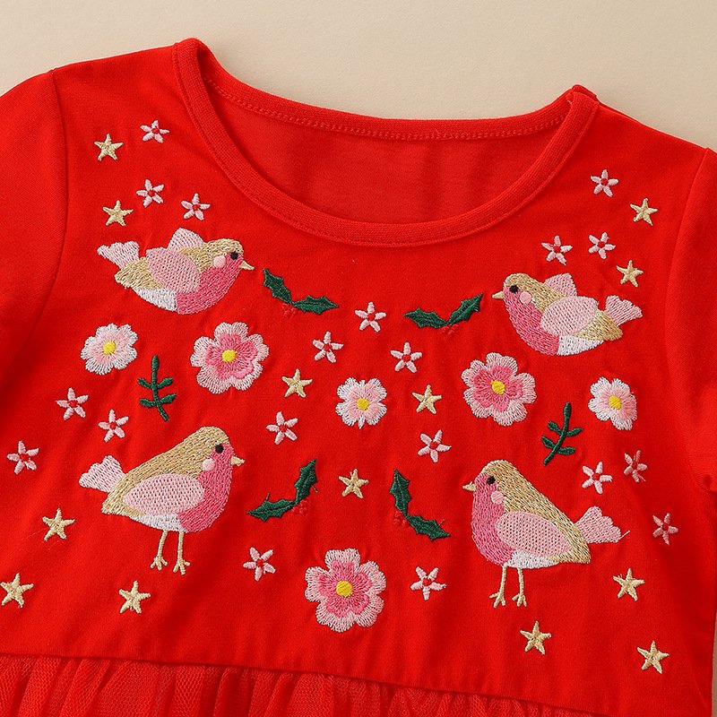 Kids Toddler Girls Spring Autumn Fashion Casual Cute Solid Color Bird Flower Embroidered Long Sleeve Round Neck Mesh Dress