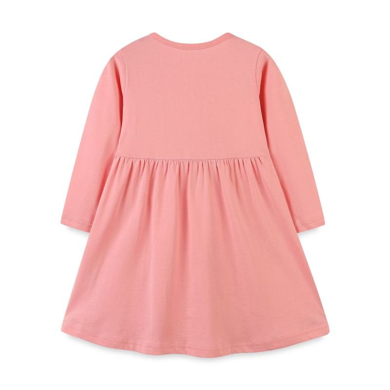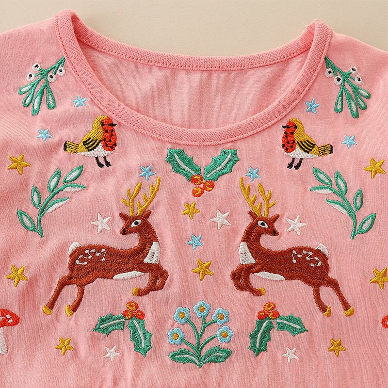 Kids Toddler Girls Spring Autumn Fashion Casual Cute Solid Color Cartoon Fawn Bird Embroidered Round Neck Long Sleeve Dress