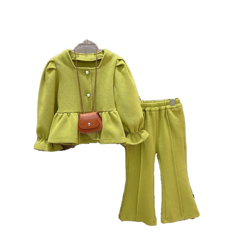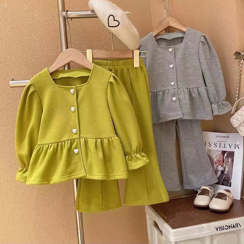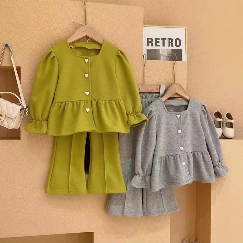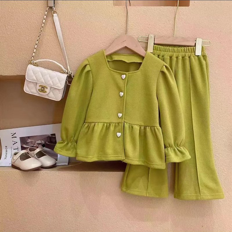 Kids Toddler Girls Spring Casual Cute Solid Color Long Sleeve Flounced Coat Flare Trousers Set