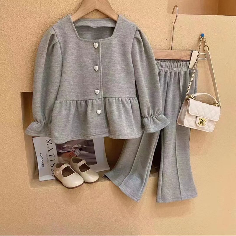 • Grey Ruffled Long Sleeve Flared Pants Suit – 6Y (130)