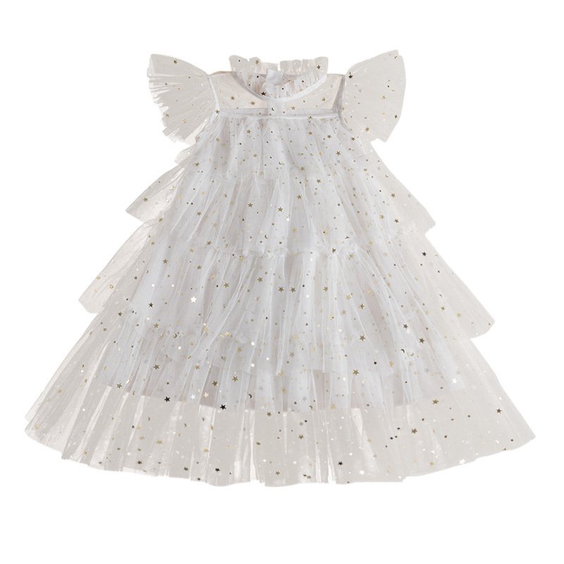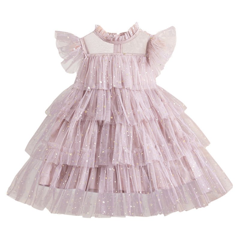 Kids Toddler Girls Summer Fashion Party Cute Sweet Solid Color Sequins Bow Pleated Raglan Sleeve Mesh Party Tutu Dress