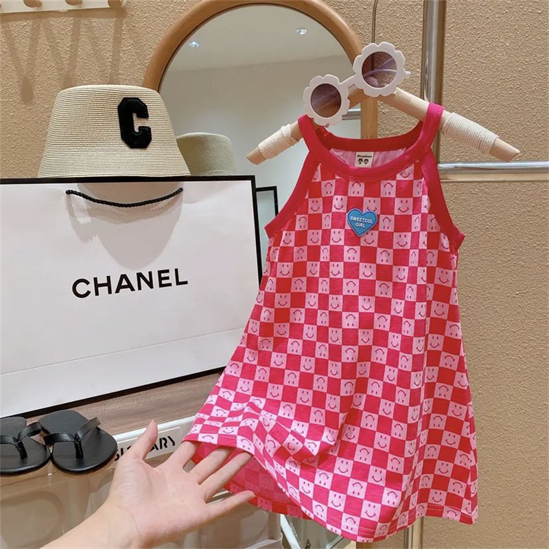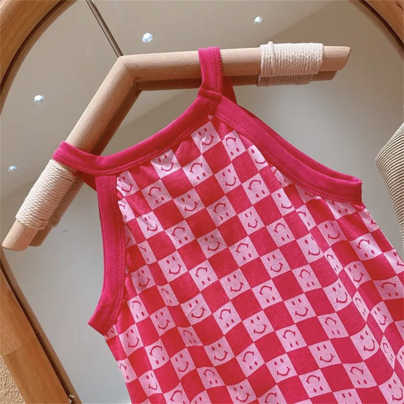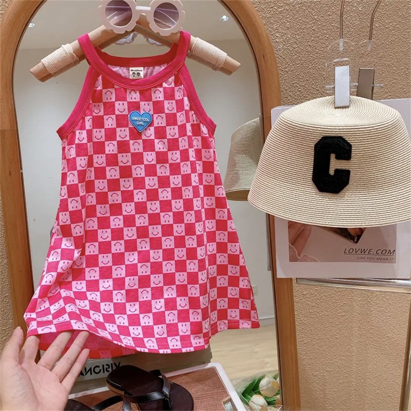 Kids Toddler Girls Summer Fashion Sweet Solid Color Plaid Smiley Pattern Sleeveless Dress