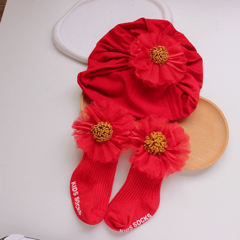 • 83 (Dark Red) / Gauze Flower Hat Stockings – One Size