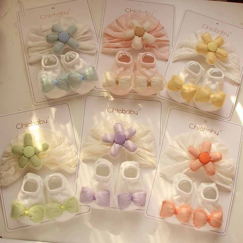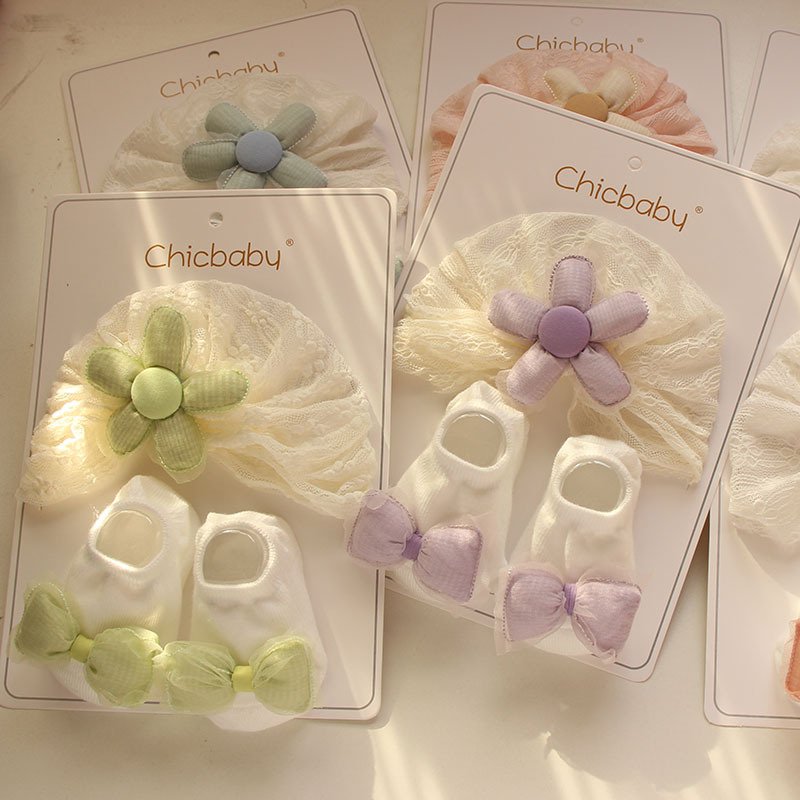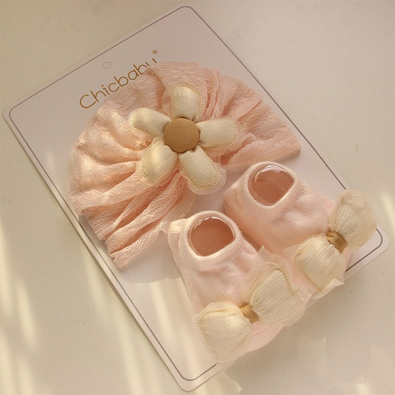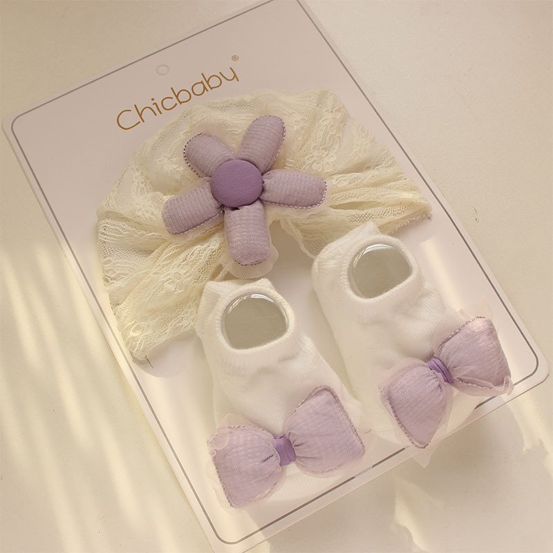 • Purple Flower Beige Fine Grain Lace Hat Small Socks – One Size