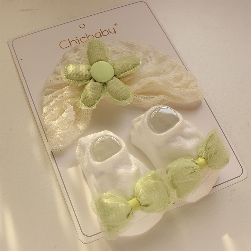• Green Gauze Beige Fine Lines Lace Hat Socks – One Size