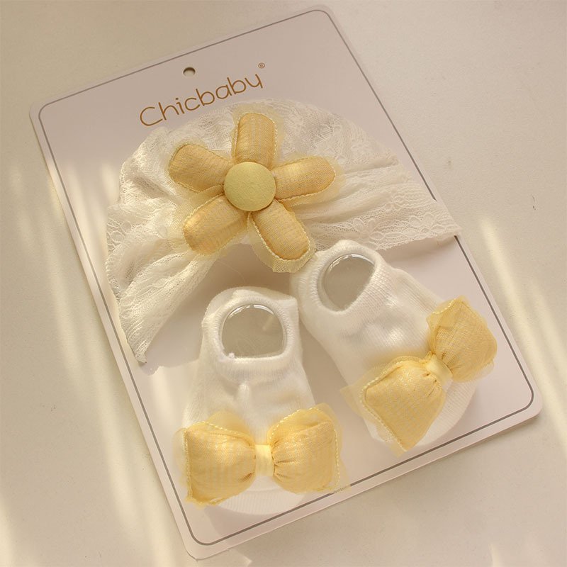 • Yellow Gauze White Fine Lines Lace Hat Socks – One Size
