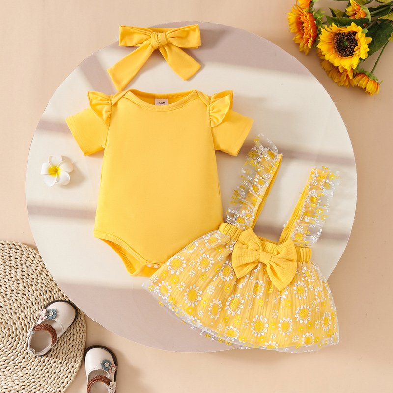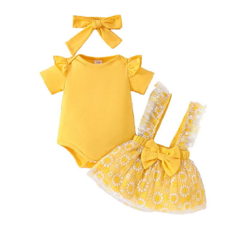 Summer Baby Girl Short-Sleeved Strap Mesh Skirt Three-Piece Set