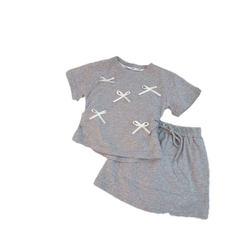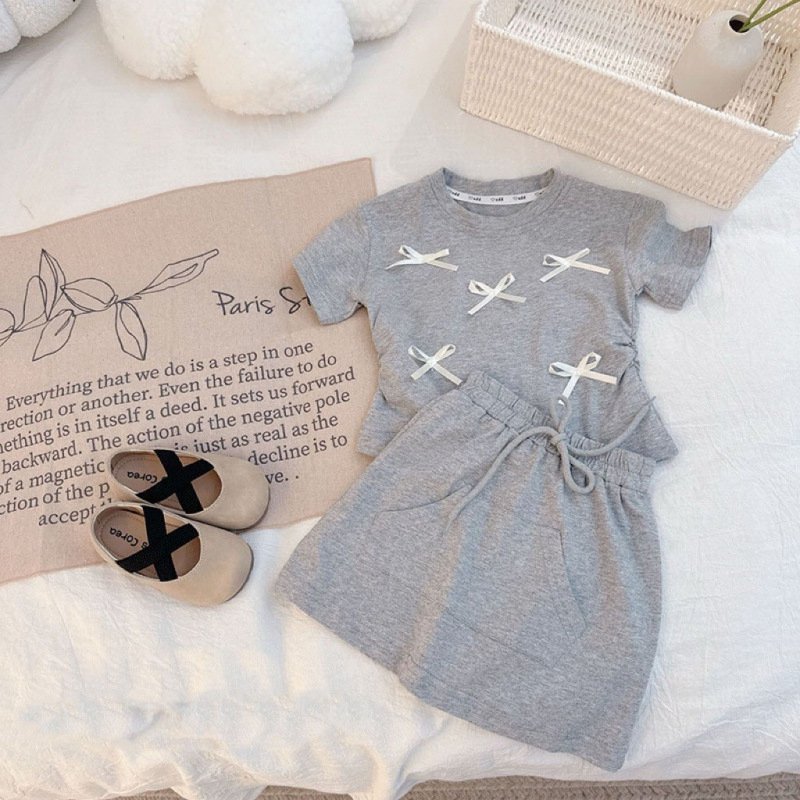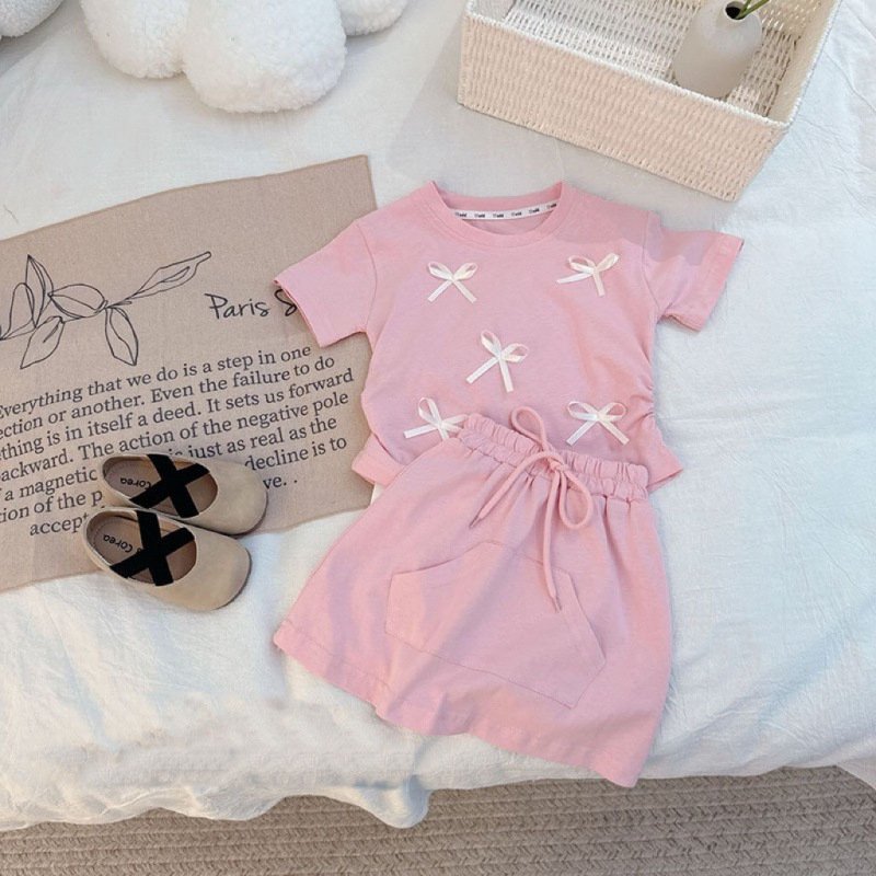 Summer Girls Short Sleeve Bow Top Skirt Two-Piece Set