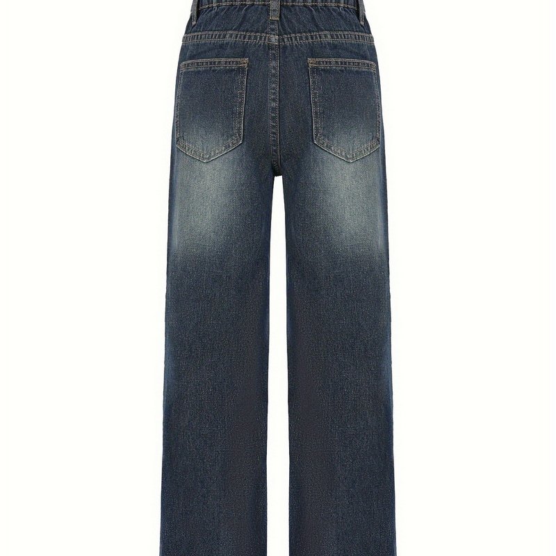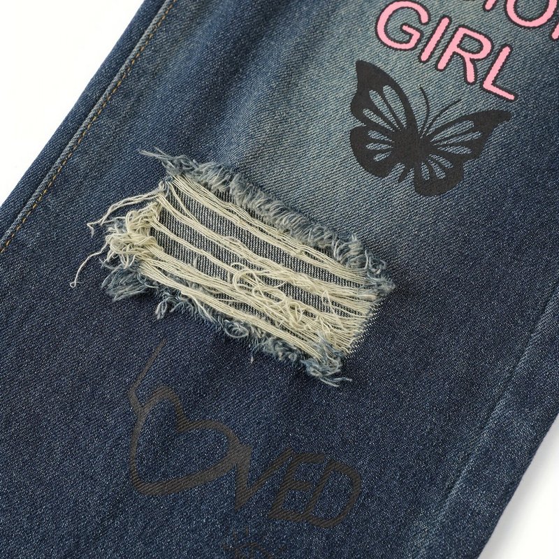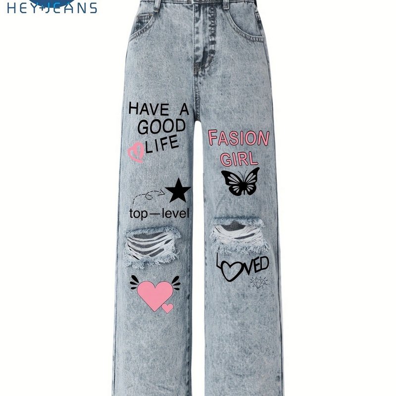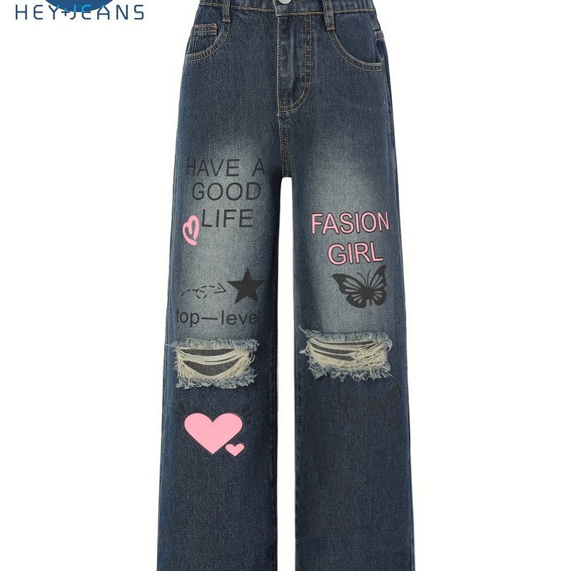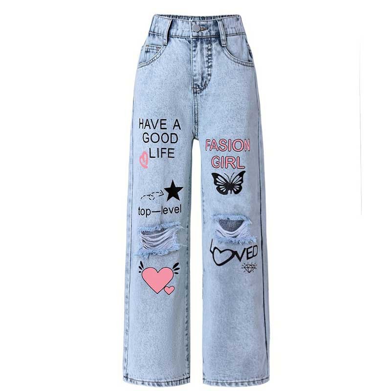 Teenager Big Girls Letter Print Ripped Wide Leg Jeans