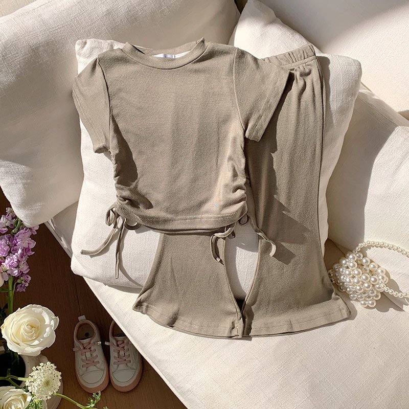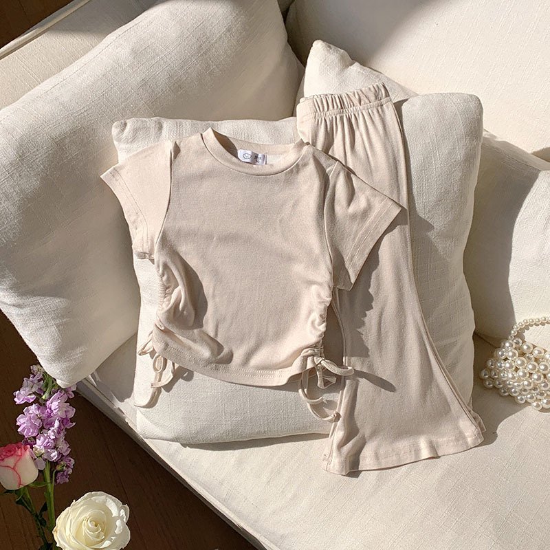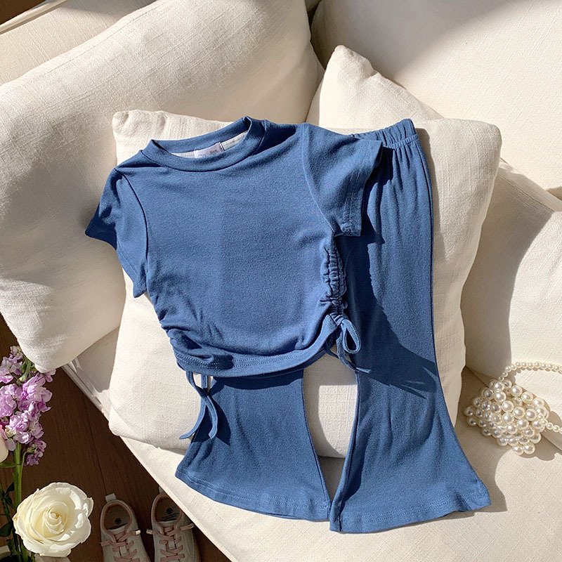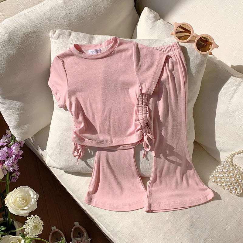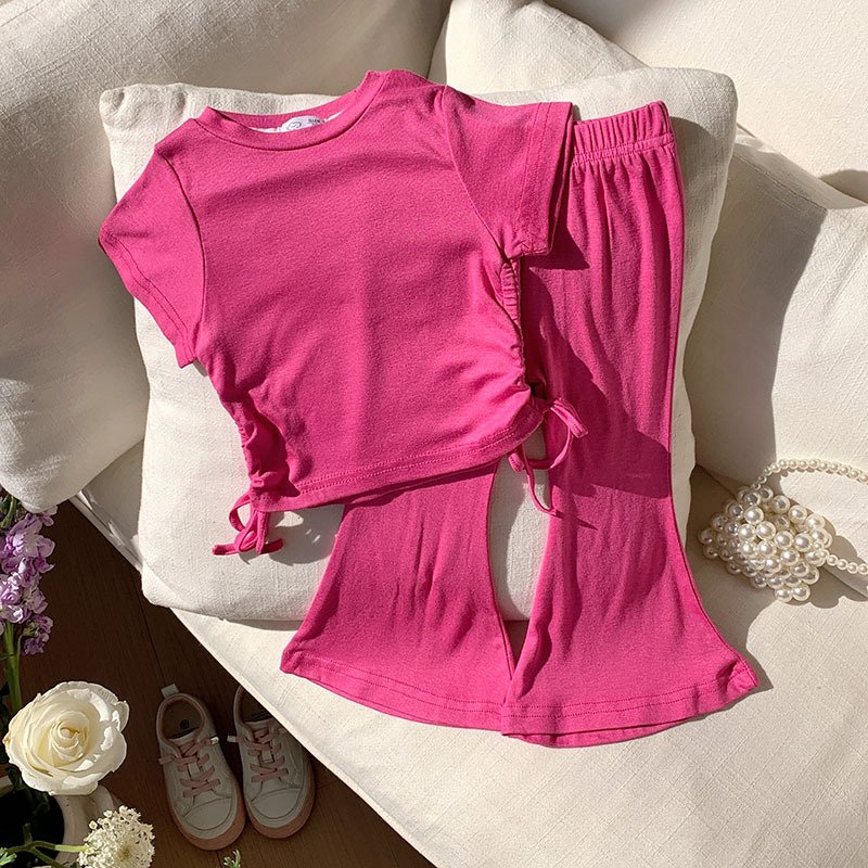 Toddler Girls Solid Color Drawstring Short Sleeve Top Wide Leg Pants Set