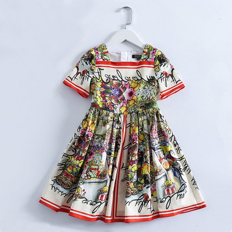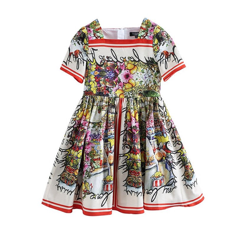 Toddler Kids Girl Fashion Short Sleeve Cotton Full Print Floral Castle Dress