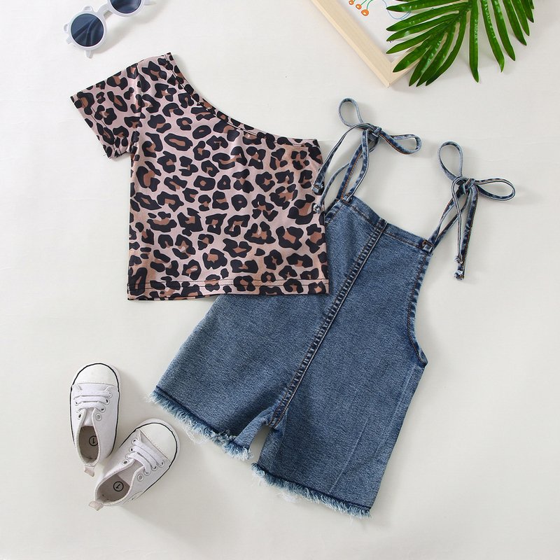 Toddler Newborn Baby Infant Girls Leopard Slanted Shoulder Top And Denim Shorts 2pcs Set