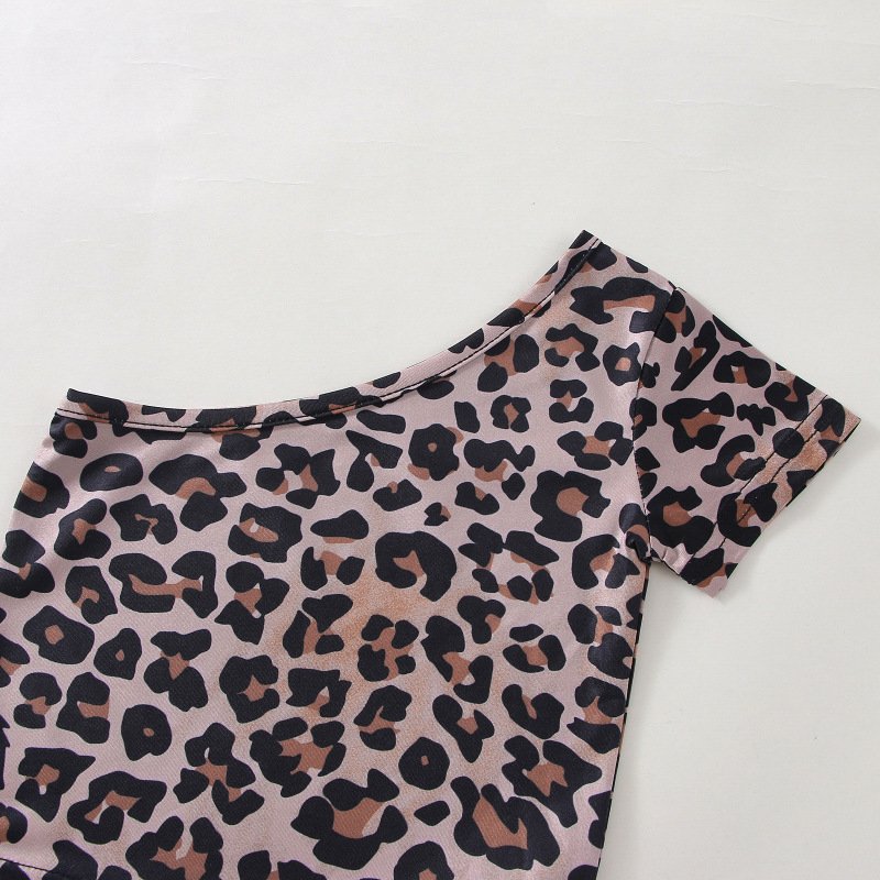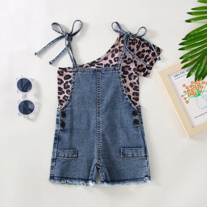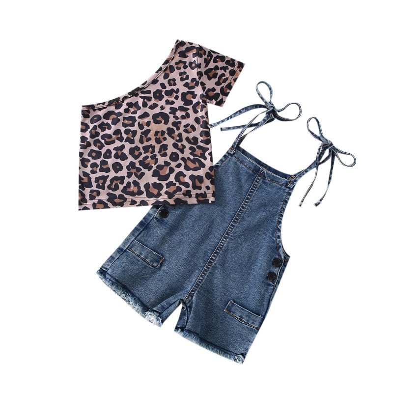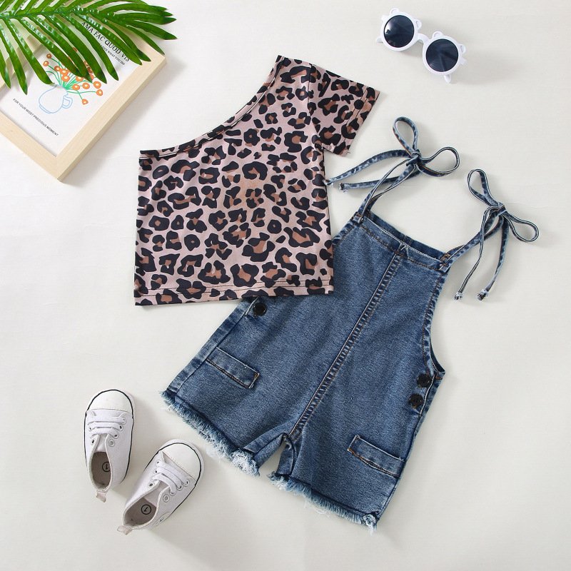 Toddler Newborn Baby Infant Girls Leopard Slanted Shoulder Top And Denim Shorts 2pcs Set